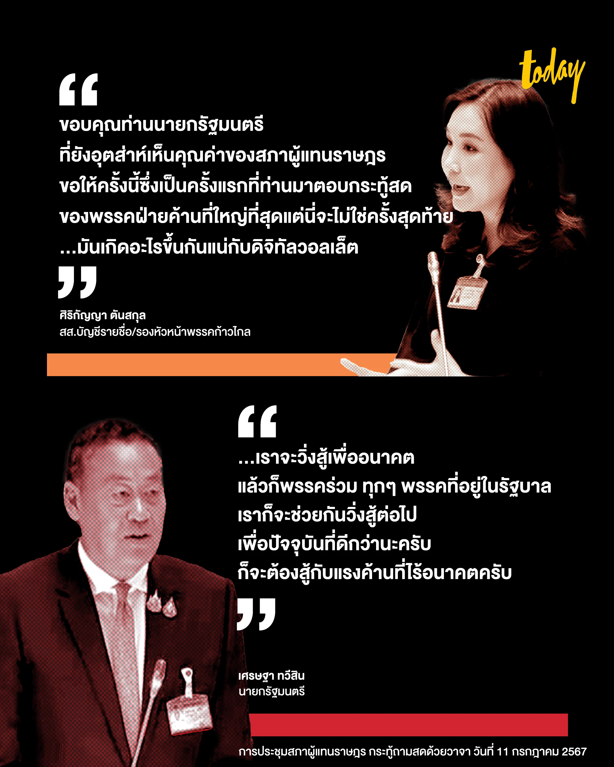 ในการประชุมสภาผู้แทนราษฎร วันที่ 11 กรกฎาคม 2567 ที่มีนายวันมูหะมัดนอร์ มะทา ประธานสภาผู้แทนราษฎร เป็นประธานการประชุม พิจารณากระทู้ถามสดด้วยวาจา ของน.ส.ศิริกัญญา ตันสกุล สส.บัญชีรายชื่อ รองหัวหน้าพรรคก้าวไกล ตั้งกระทู้ถาม นายเศรษฐา ทวีสิน นายกรัฐมนตรี 3 ข้อเกี่ยวกับโครงการเติมเงิน 10,000 บาท ผ่านดิจิทัลวอลเล็ต, มาตรการพยุงค่าครองครองชีพประชาชนในระยะสั้น และผลจากมาตรการกระตุ้นธุรกิจอสังหาริมทรัพย์ ซึ่งวันนี้ นายเศรษฐา เดินทางเข้าสภาฯ มาตอบกระทู้ดังกล่าวด้วยตนเอง