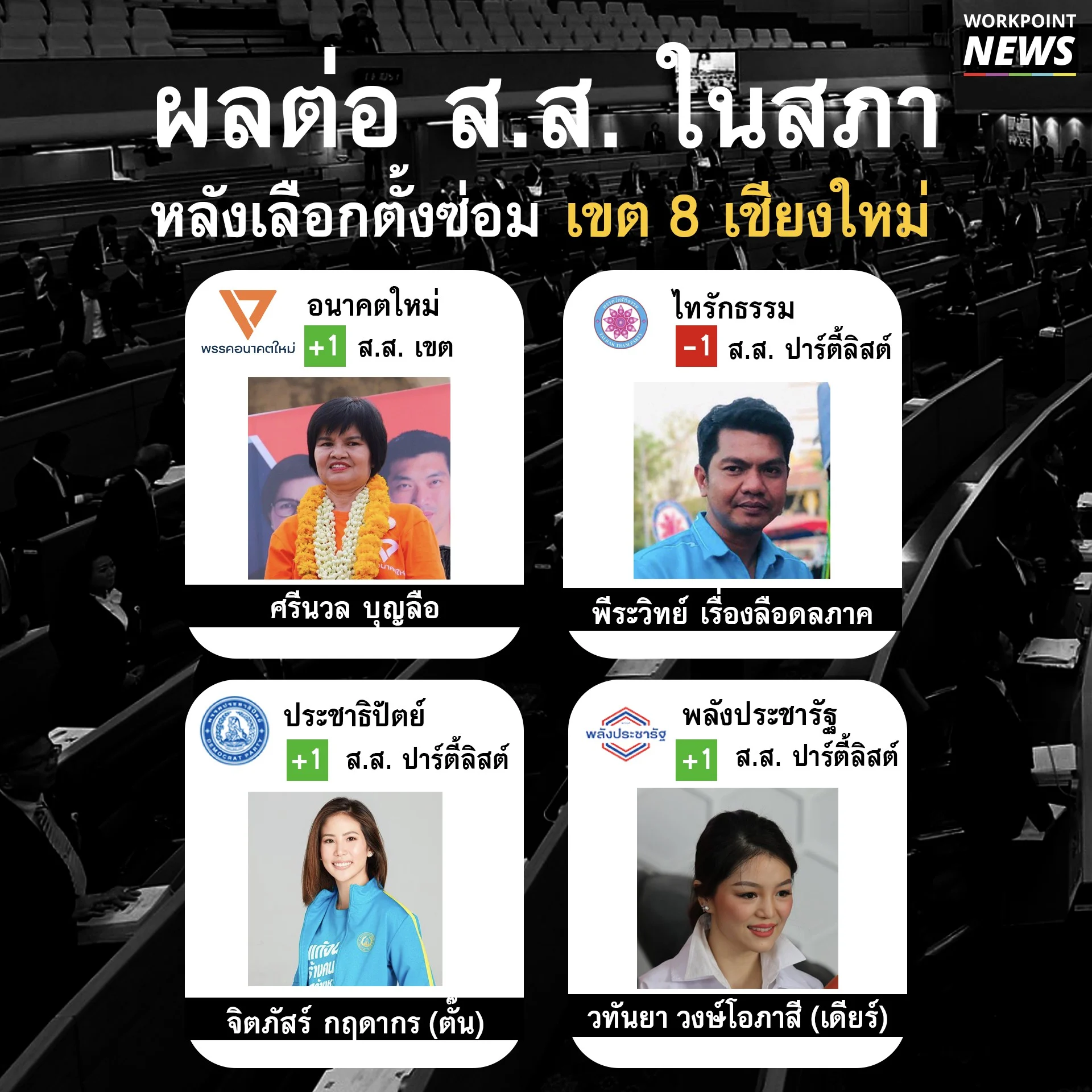 แต่จะเกิดการเปลี่ยนแปลง โดยพรรคพลังประชารัฐ และ พรรคประชาธิปัตย์ จะได้ขยับ ส.ส.ปาร์ตี้ลิสต์เพิ่มพรรคละ 1 คน ได้แก่พรรคประชาธิปัตย์ได้ ส.ส.ปาร์ตี้ลิสต์เพิ่มจาก 18 คน เป็น 19 คน ได้แก่ น.ส.วทันยา วงษ์โอภาสี หรือ มาดามเดียร์ ส่วนพรรคประชาธิปัตย์ ส.ส.ปารี้ลิสต์จาก 19 คน เป็น 20 คน คือ น.ส.จิตภัสร์ กฤดากร หรือ ตั๊น