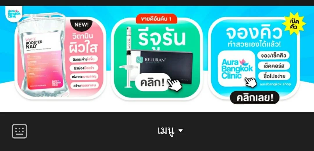 หน้าต่างเมนูลัดที่จะเห็นเป็นอย่างแรกเมื่อลูกค้าเข้าสู่ LINE OA ซึ่งคลินิกจะเปลี่ยนหน้าตา Rich Menu ใหม่ทุกซีซั่น เช่น ช่วงนี้กำลังฮิตฉีดผิวฉ่ำด้วยรีจูรัน ลูกค้าก็จะเห็นรีจูรันอยู่ที่ Rich Menu แต่ถึงจะเปลี่ยนหน้าตาบ่อย แต่สิ่งหนึ่งที่ต้องมีเสมอคือลิงก์ LINE SHOPPING