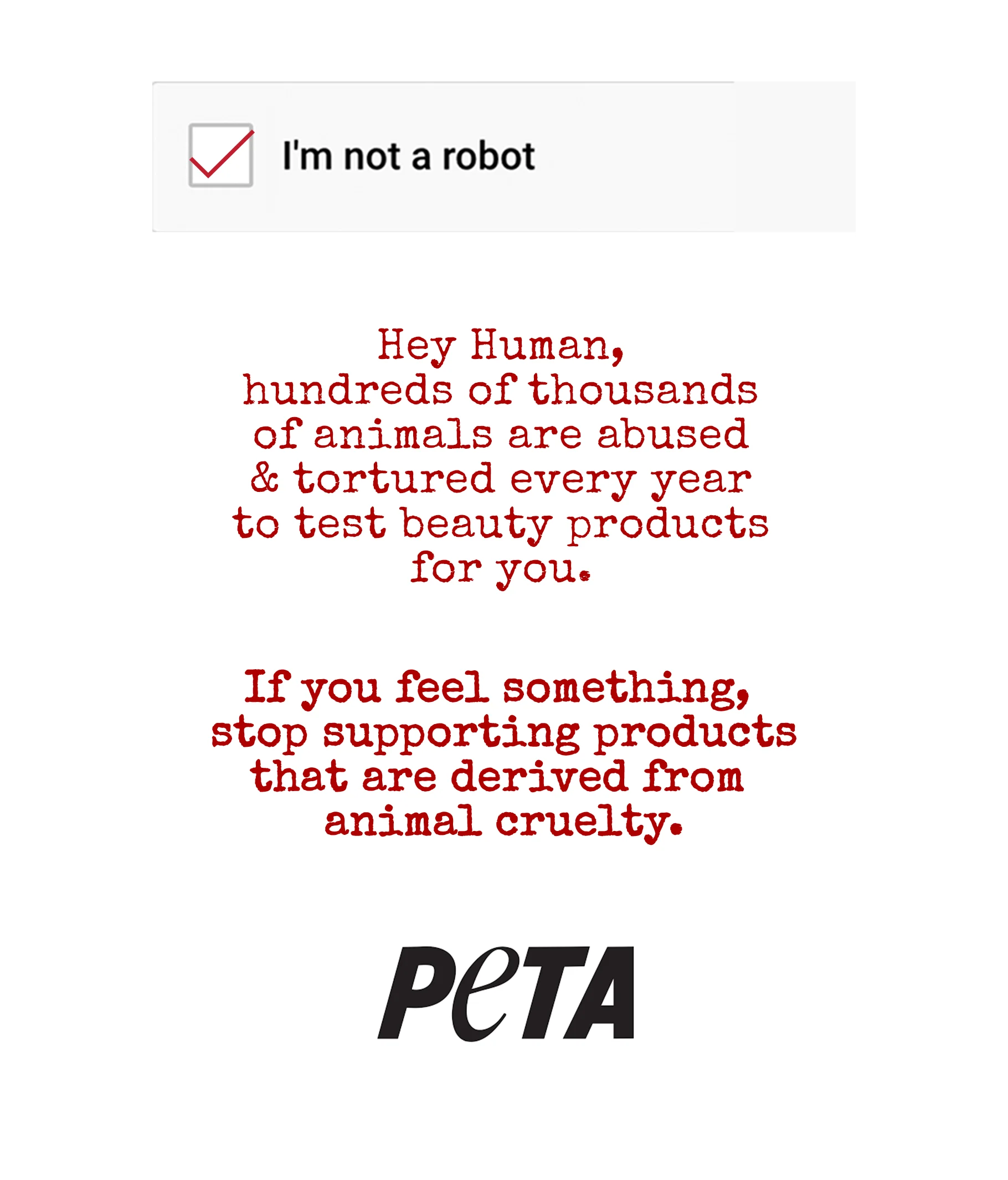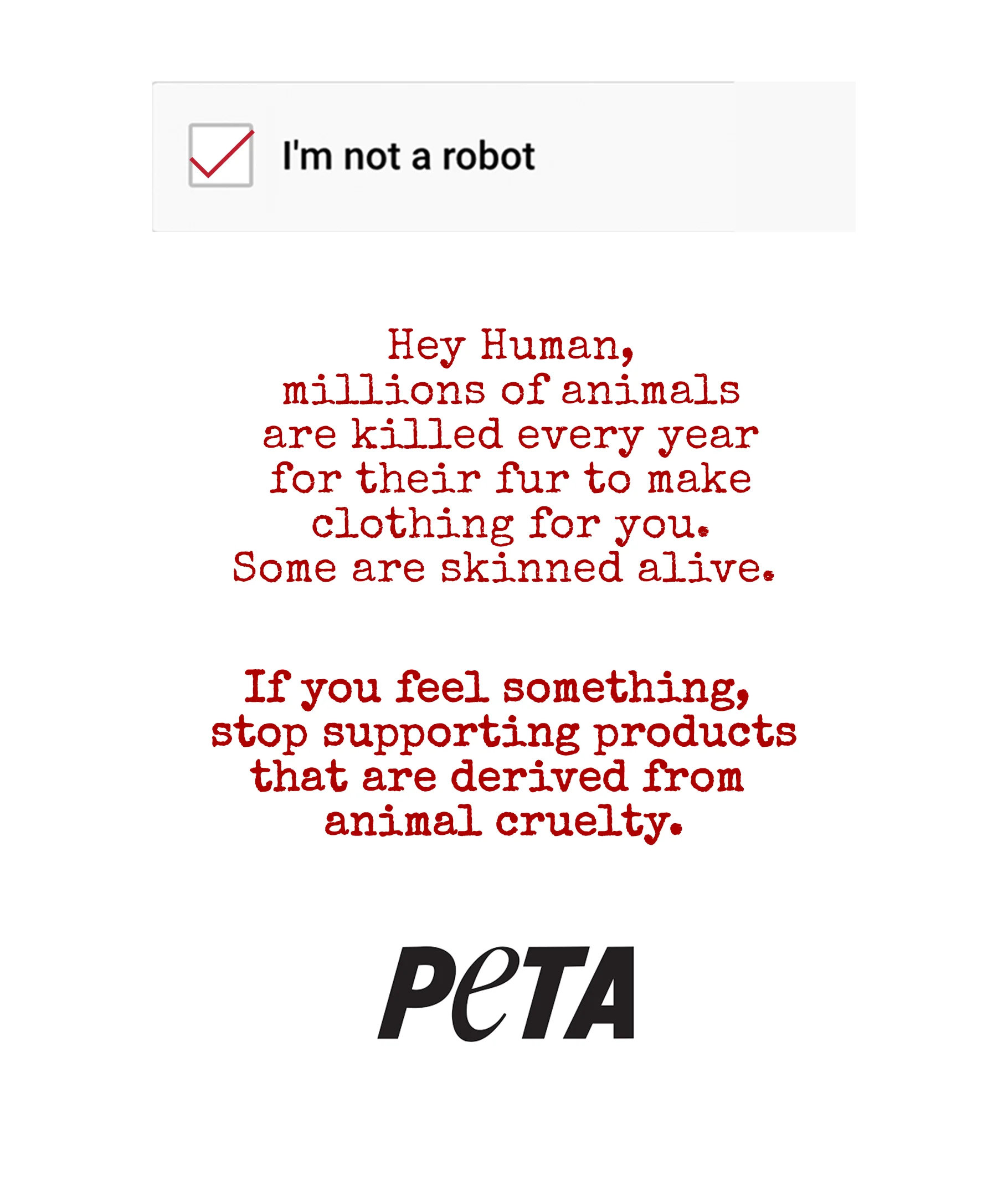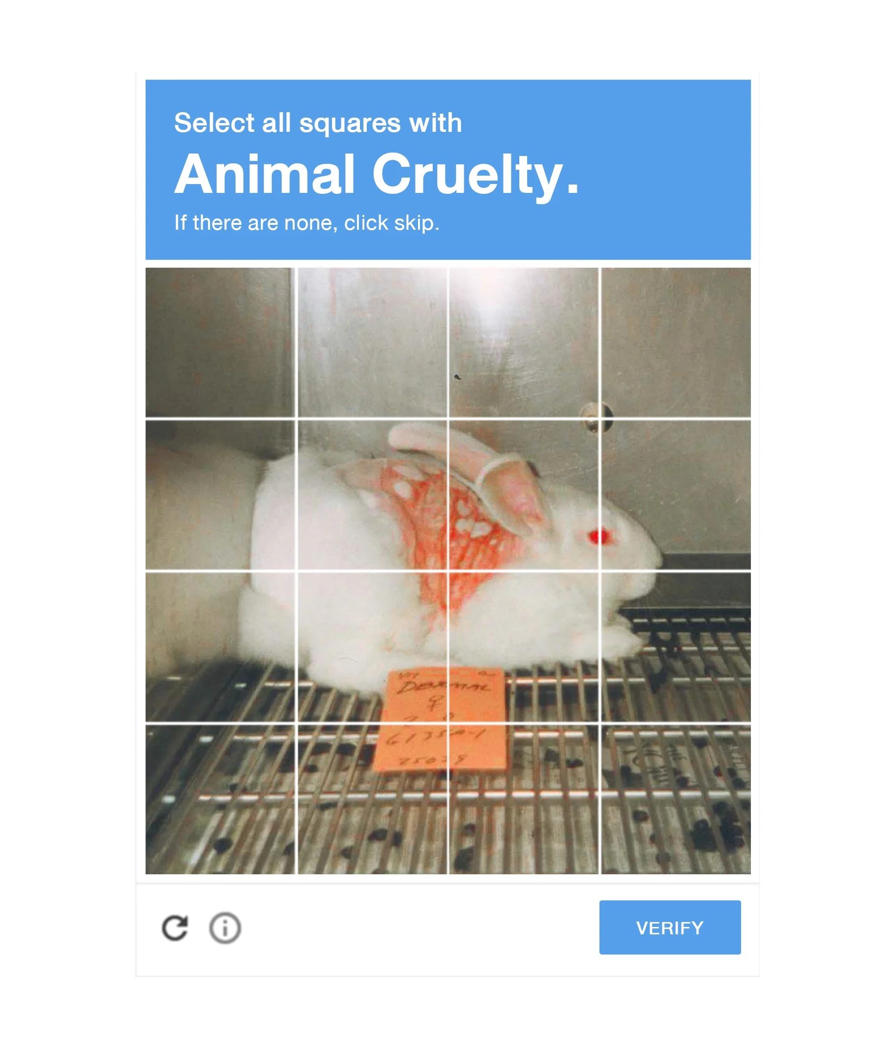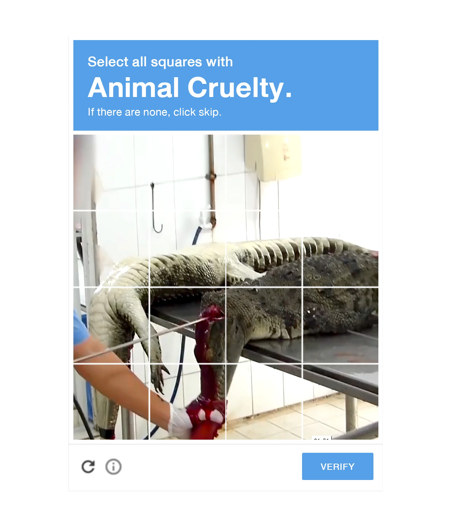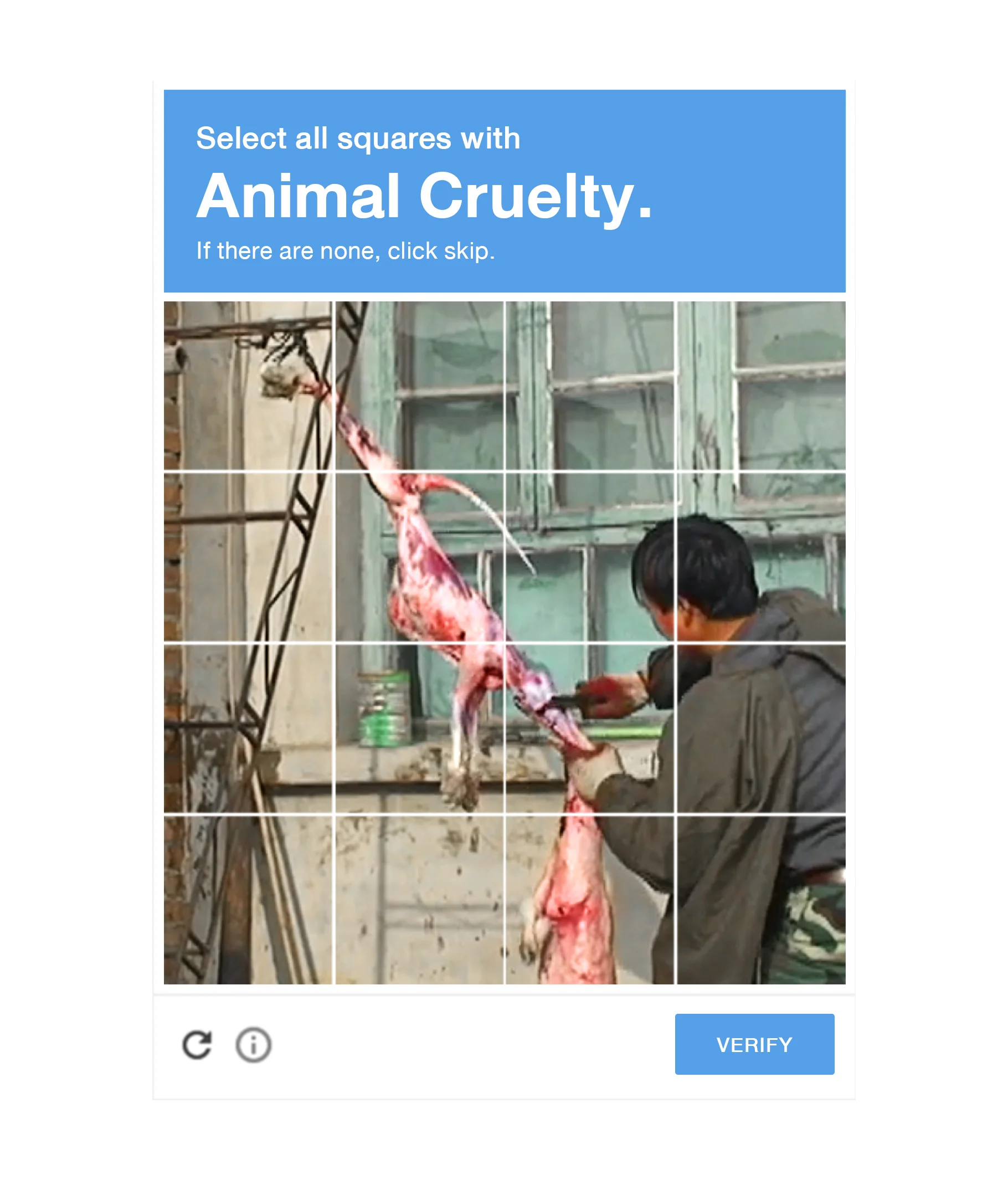 อย่างไรก็ตาม แทนที่จะขอให้ผู้ใช้การค้นหาป้ายถนน ภาพที่ปรากฏจึงกลายเป็นภาพการกระทำที่โหดร้ายต่อสัตว์แทน เนื่องจากผู้ใช้ถูกขอให้ระบุรูปภาพที่มีการทารุณกรรมสัตว์ เพื่อพิสูจน์ว่าพวกเขาเป็น “มนุษย์” พวกเขายังได้รับการเตือนอย่างชัดเจนถึงสาระสำคัญของสิ่งที่ทำให้มนุษย์เป็น ซึ่งก็คือมนุษย์ต้องมีความเมตตาต่อสรรพสัตว์ ลงท้ายด้วยข้อความว่า “ถ้าคุณรู้สึกบางอย่างให้หยุดสนับสนุนผลิตภัณฑ์ที่ได้มาจากการทารุณกรรมสัตว์”