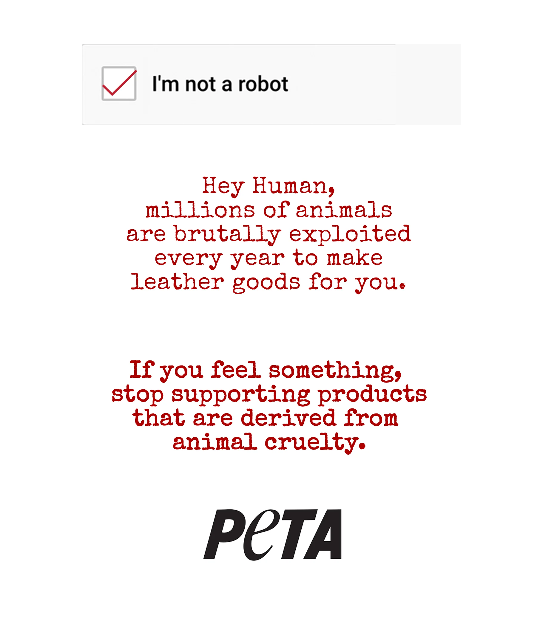 ในเดือนเมษายน ปี พ.ศ. 2564 PETA ประเทศไทยได้พัฒนาแคมเปญ “The Human Check” โดยใช้ CAPTCHA ซึ่งเป็นการทดสอบที่แยกความแตกต่างระหว่างหุ่นยนต์และมนุษย์ มักใช้บนเว็บไซต์เพื่อลดสแปมและยืนยันผู้ใช้ที่ถูกต้องโดยข้อความทั่วไปที่มักจะขึ้นคือ “เลือกภาพทั้งหมดที่มีป้ายถนน”
