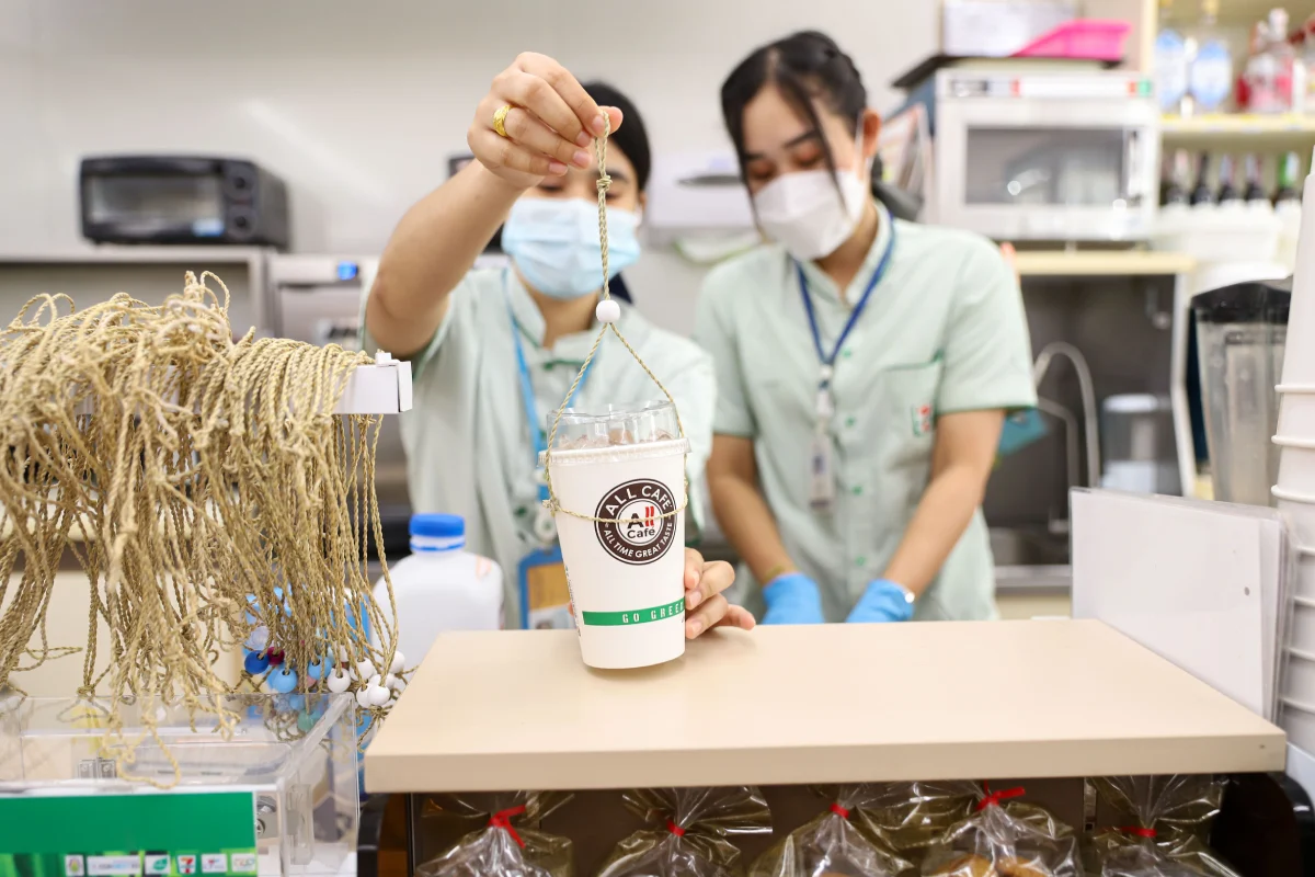 เซเว่นฯ ที่เกาะพะงัน ยังเปลี่ยนมาใช้เชือกกระจูดแทนถุงใส่แก้วพลาสติก ช้อนชงกาแฟทำมาจากไม้ไผ่ซึ่งย่อยสลายได้ตามธรรมชาติ ที่นี่ยังมีการแยกขยะ ซึ่งรวมไปถึงการแยกขยะอาหารที่เกิดขึ้นจากอาหารหมดอายุหรือไม่ดีพอสำหรับการขายจากในร้านด้วย เช่น นม เป็นต้น ซึ่งขยะอาหารเหล่านี้ก็จะถูกนำไปแปรรูปแล้วส่งต่อให้เกษตรกรนำไปใช้ต่อไป
