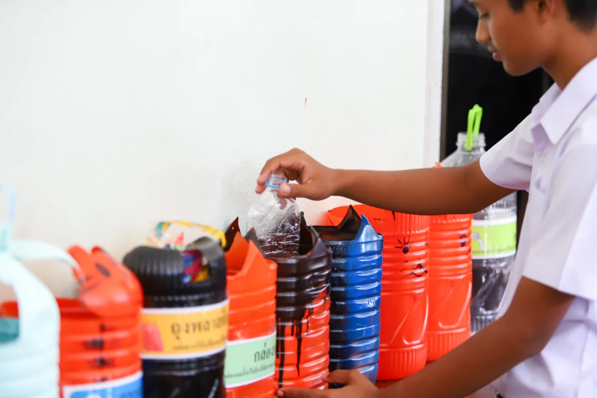 ในเดือนพฤษภาคม 2566 จากที่แต่ละห้องเรียนมีถังขยะ 2 ใบสำหรับใส่กระดาษและขยะอื่นๆ ก็เปลี่ยนถังนับ 10 ใบที่นำมาแยกใส่วัสดุเหลือทิ้งอย่างละเอียด กล่าวคือ ถังแต่ละใบมีหน้าที่เป็นภาชนะของวัสดุแต่ละอย่างอย่างชัดเจน เช่น ขวดน้ำ, ฝาขวด, ฉลากขวดน้ำ, ถุงขนม, ขี้ยางลบ, ไส้ปากกา, กล่องนม, กระดาษสี, เศษดินสอ, ถังใส่น้ำทิ้ง เป็นต้น