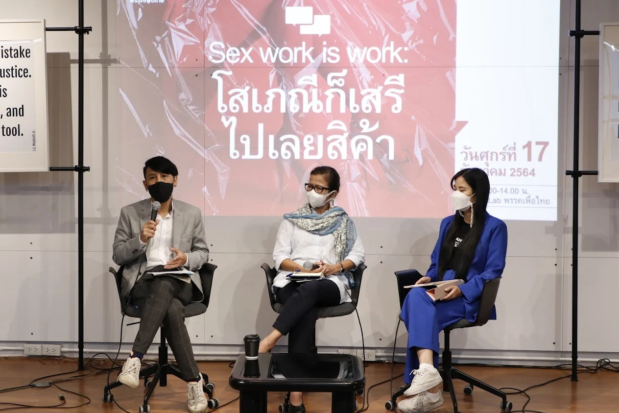 งานเสวนา หัวข้อ ‘Sex work is work : โสเภณีก็เสรีไปเลยสิค้า’ จัดโดยพรรคเพื่อไทยเนื่องในวันยุติความรุนแรงผู้ค้าบริการทางเพศสากลเพื่อสร้างความตระหนักถึงความรุนแรงที่เกิดขึ้นต่ออาชีพ sex worker, เสนอทางยุติความรุนแรงผ่านการคุ้มครองสิทธิทางกฎหมาย และ ดูตัวเลขทางเศรษฐกิจที่จะเกิดหาก การค้าบริการทางเพศถูกทำให้ถูกกฎหมาย