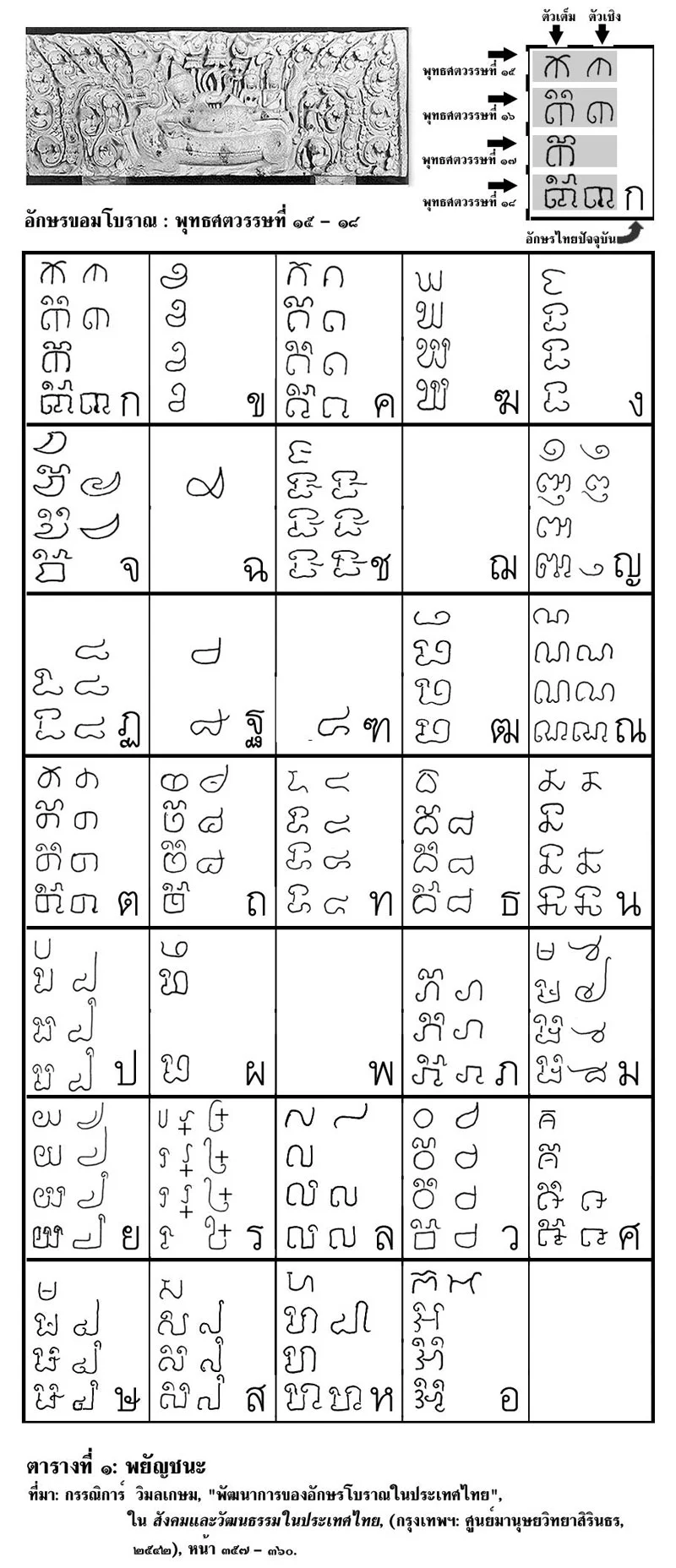รูปแบบอักษรขอมโบราณ พุทธศตวรรษที่ ๑๕ – ๑๘ สังเกตได้ว่าไม่มีตัวอักษร ฃ และ ฅ (ภาพจากศูนย์มานุษยวิทยาสิรินธร)