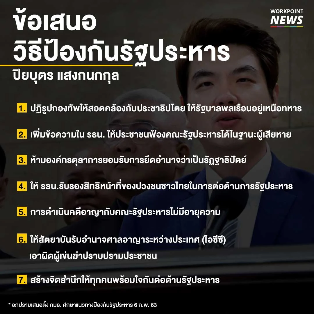 วันที่ 6 ก.พ. ที่รัฐสภา นายปิยบุตร แสงกนกกุล ส.ส.บัญชีรายชื่อ พรรคอนาคตใหม่ อภิปรายในการเสนอ ญัตติขอให้สภาผู้แทนราษฎรตั้งคณะกรรมาธิการ (กมธ.) วิสามัญเพื่อศึกษาแนวทางป้องกันไม่ให้เกิดรัฐประหารขึ้นอีกในอนาคต โดยระบุถึงความจำเป็นต้องมี กมธ.ชุดนี้ว่า ตราบใดที่เรายังไม่สามารถปฏิรูปกองทัพ ตราบใดที่เรายังไม่สามารถหาแนวทางป้องกันการรัฐประหารได้อย่างถูกต้องเหมาะสม ก็มีโอกาสอยู่เสมอที่จะมีการรัฐประหารเกิดขึ้นได้ตลอดเวลา