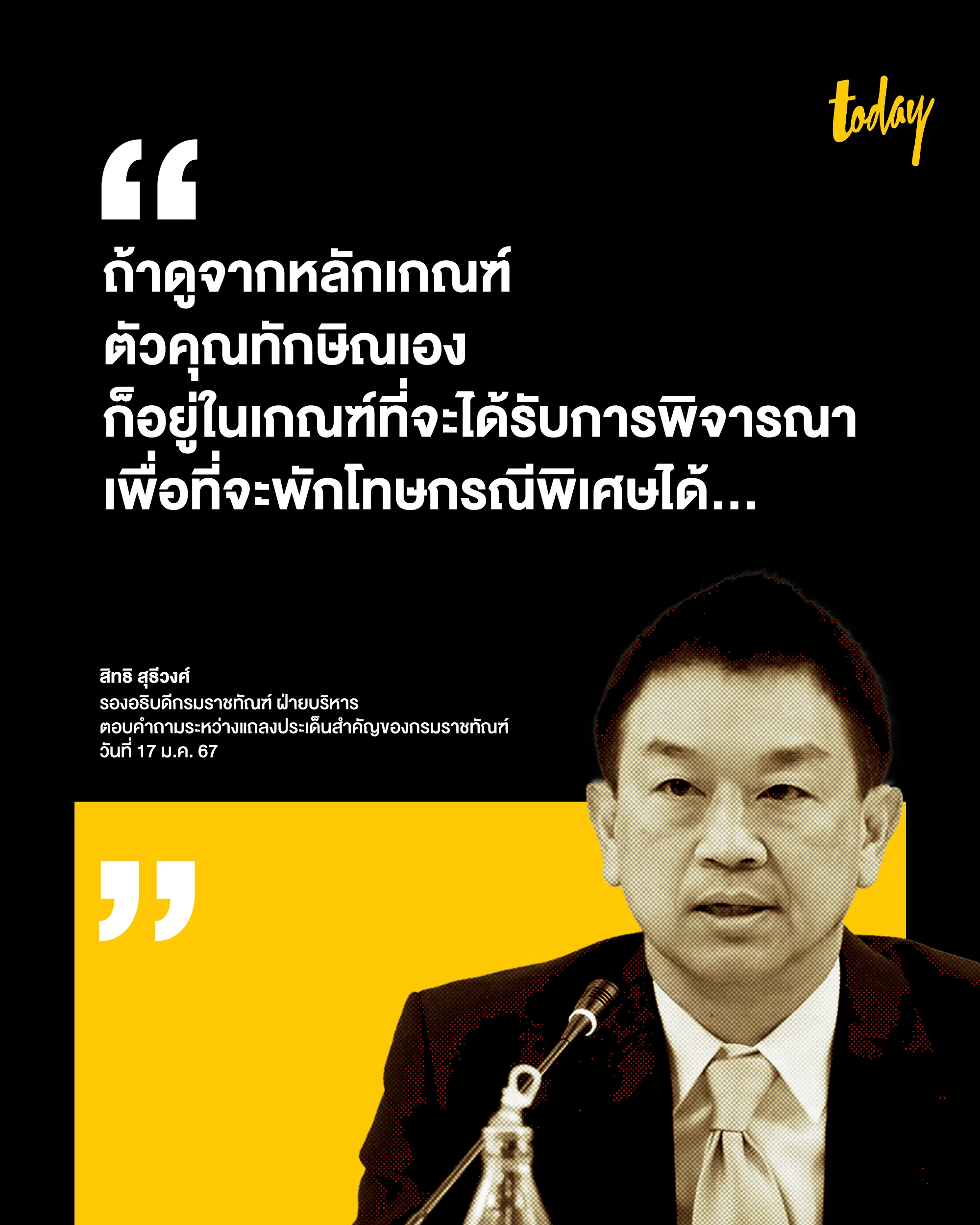 เมื่อถามว่า กรณีนายทักษิณ อายุ 74 ปี สูงวัย และป่วย น่าจะห้วงเดือนกุมภาพันธ์ 2567 มีความเป็นไปได้หรือไม่ที่นายทักษิณจะได้รับการพักโทษ นายสิทธิ ตอบว่า “ถ้าดูจากหลักเกณฑ์นะครับ ตัวคุณทักษิณเองนะครับ ก็อยู่ในเกณฑ์ที่จะได้รับการพิจารณา เพื่อที่จะพักโทษกรณีพิเศษได้ แต่ทั้งนี้และทั้งนั้น ก็ต้องเรียนว่า ณ วันนี้ ทางกรมราชทัณฑ์เองยังไม่ได้รับรายงานจากเรือนจำพิเศษกรุงเทพมหานคร ก็เลยยังไม่มีข้อมูลตรงนี้”