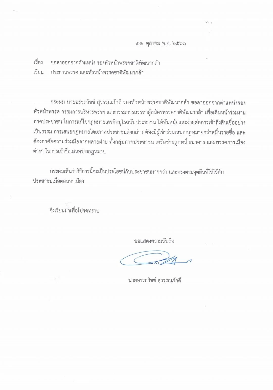 ‘อรรถวิชช์’ ลาออกจาก รองหัวหน้าพรรคชาติพัฒนากล้า เผย จะเดินหน้าร่วมแก้ไขกฎหมายเครดิตบูโร กับภาคประชาชน