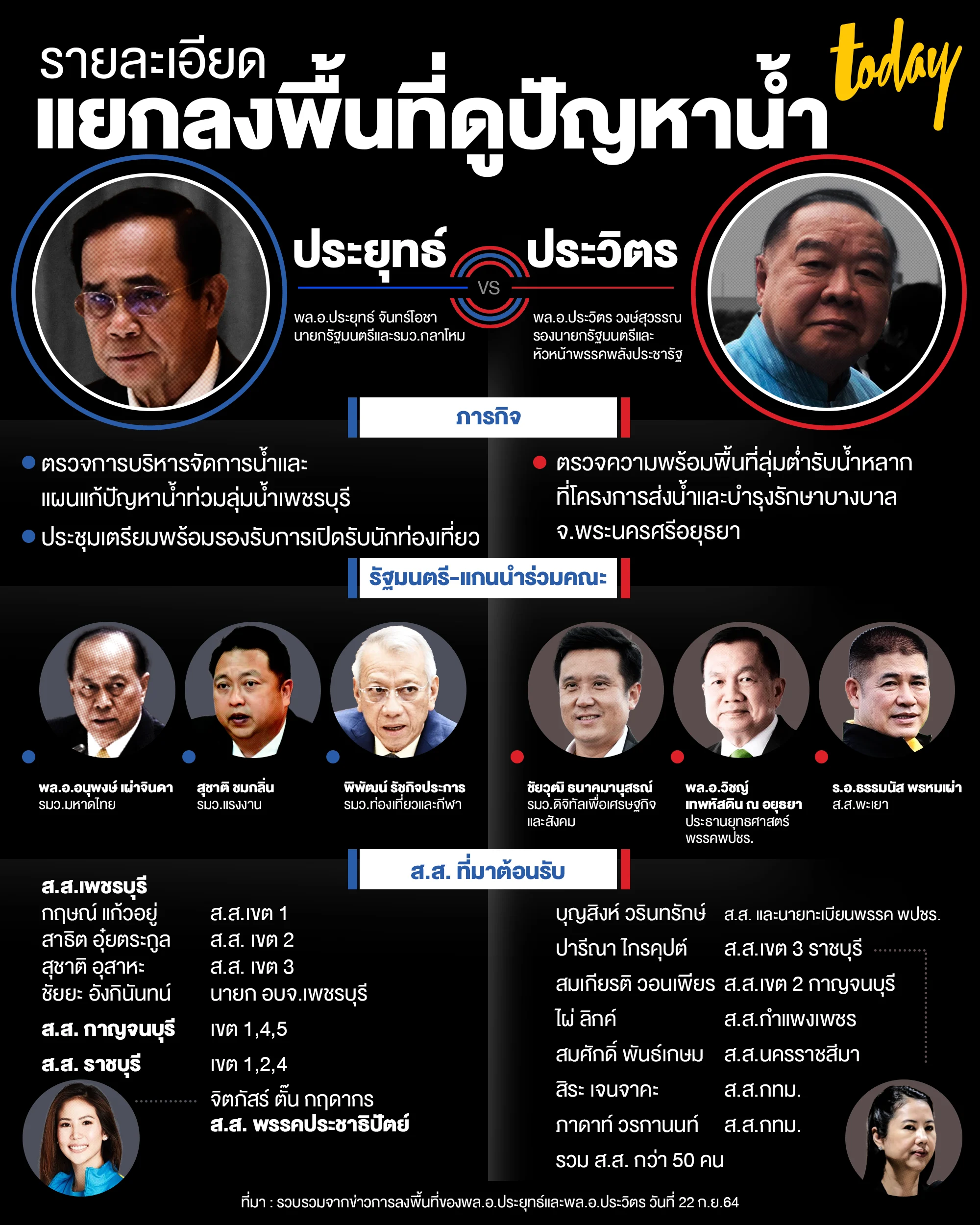 วันที่ 22 ก.ย. 2564 พล.อ.ประยุทธ์ จันทร์โอชา นายกรัฐมนตรีและรมว.กลาโหม กับ พล.อ.ประวิตร วงษ์สุวรรณ รองนายกรัฐมนตรี และหัวหน้าพรรคพลังประชารัฐ (พปชร.) แยกกันลงพื้นที่ ติดตามสถานการณ์น้ำท่วมในพื้นที่ภาคกลาง