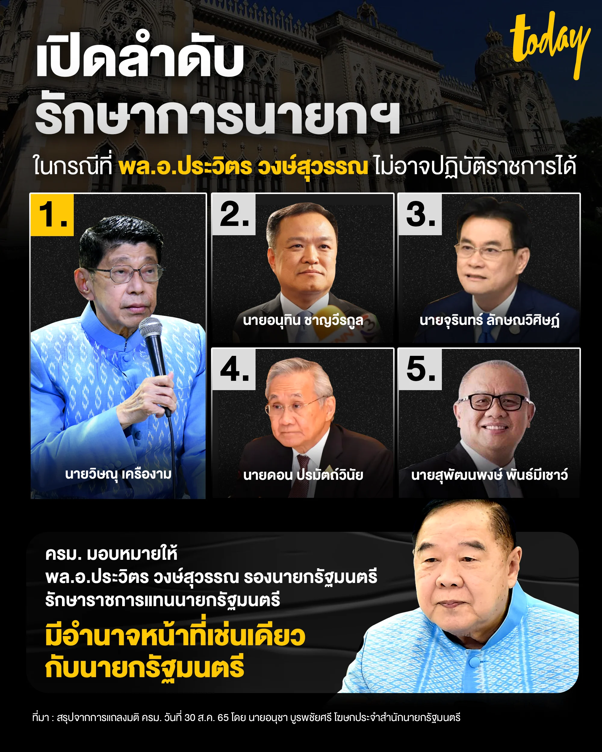 ครม. ได้มอบหมายให้รองนายกรัฐมนตรี พล.อ.ประวิตร วงษ์สุวรรณ รักษาราชการแทนนายกรัฐมนตรี ในกรณีที่ พล.อ.ประวิตรไม่อาจปฏิบัติราชการได้ ให้รองนายกรัฐมนตรี เป็นผู้รักษาราชการแทนนายกรัฐมนตรี โดยมีลำดับดังต่อไปนี้