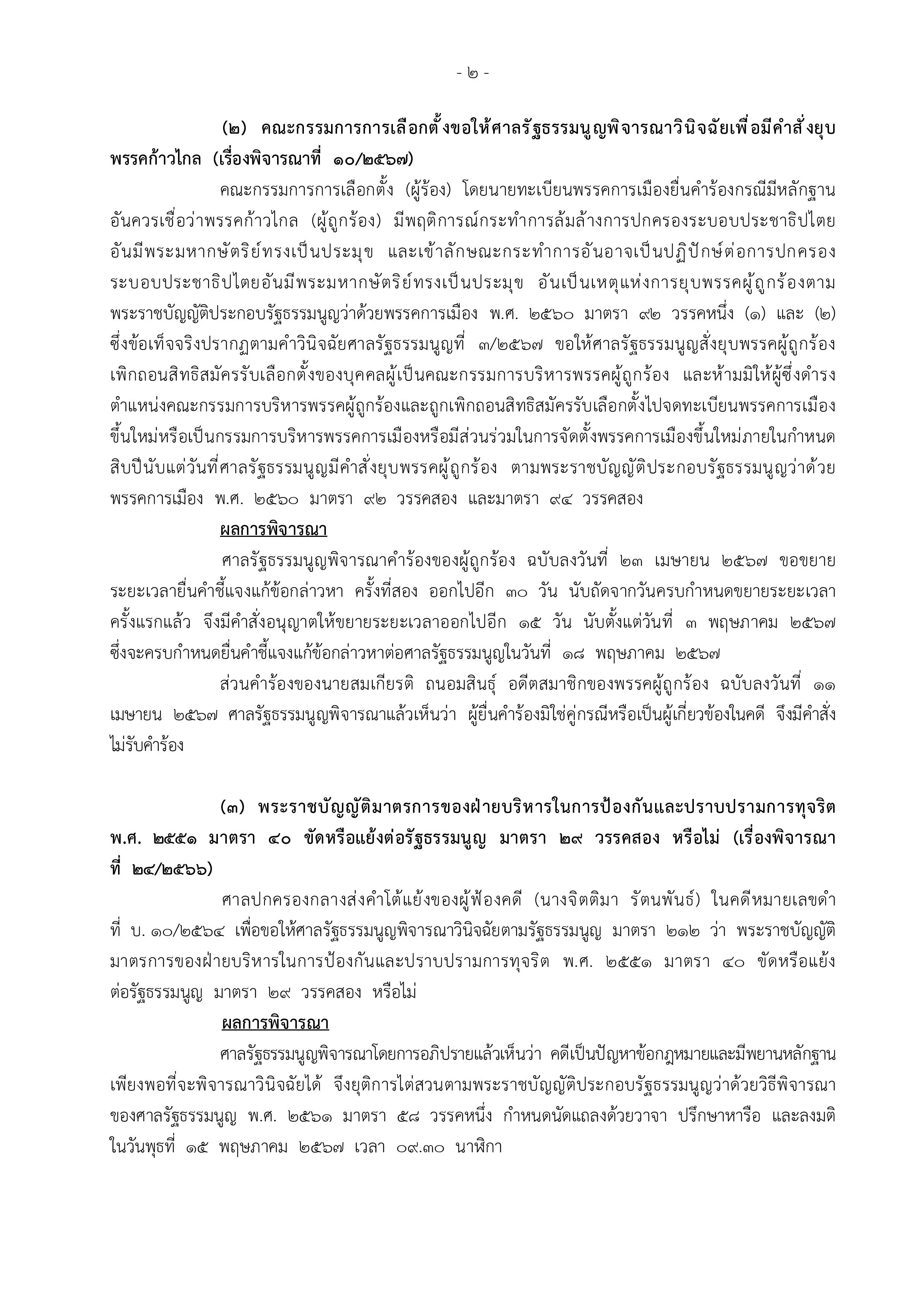 ข้อเท็จจริงปรากฏตามคำวินิจฉัยศาลรัฐธรรมนูญที่ 3/2567 ขอให้ศาลรัฐธรรมนูญสั่งยุบพรรคผู้ถูกร้องเพิกถอนสิทธิสมัครรับเลือกตั้งของบุคคลผู้เป็นคณะกรรมการบริหารพรรคผู้ถูกร้อง และห้ามมิให้ผู้ซึ่งดำรงตำแหน่งคณะกรรมการบริหารพรรคผู้ถูกร้องและถูกเพิกถอนสิทธิสมัครรับเลือกตั้งไปจดทะเบียนพรรคการเมืองขึ้นใหม่หรือเป็นกรรมการบริหารพรรคการเมืองหรือมีส่วนร่วมในการจัดตั้งพรรคการเมืองขึ้นใหม่ภายในกำหนดสิบปีนับแต่วันที่ศาลรัฐธรรมนูญมีคำสั่งยุบพรรคผู้ถูกร้อง ตาม พ.ร.ป.ว่าด้วยพรรคการเมือง พ.ศ. 2560 มาตรา 92 วรรคสอง และมาตรา 94 วรรคสอง