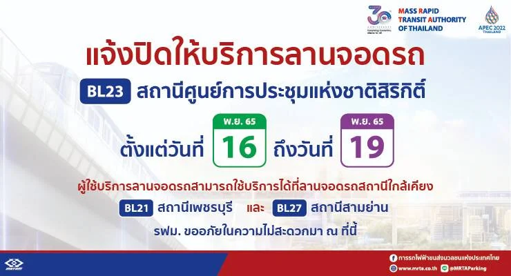 MRT แจ้งการให้บริการระหว่างการประชุมเอเปค ปิดให้บริการสถานีศูนย์การประชุมแห่งชาติสิริกิติ์ รองรับมาตรการความปลอดภัย