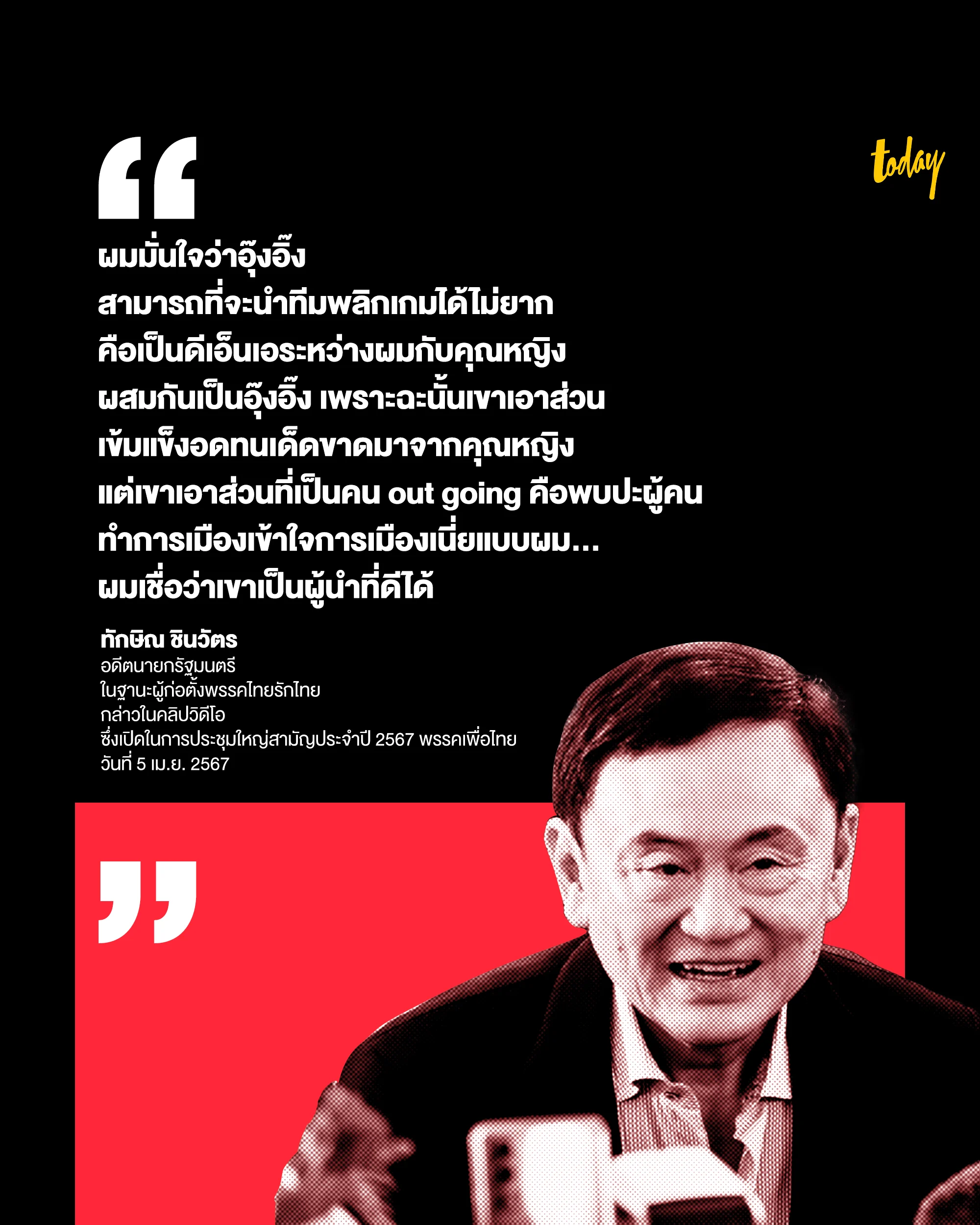 ‘ทักษิณ’ โต้ดีเอ็นเอ ‘เพื่อไทย’ ไม่ใช่พรรคอนุรักษ์นิยมใหม่ มั่นใจ ‘เศรษฐา’ นำพาประเทศได้ ดัน ‘อุ๊งอิ๊ง’ พลิกเกมการเมือง