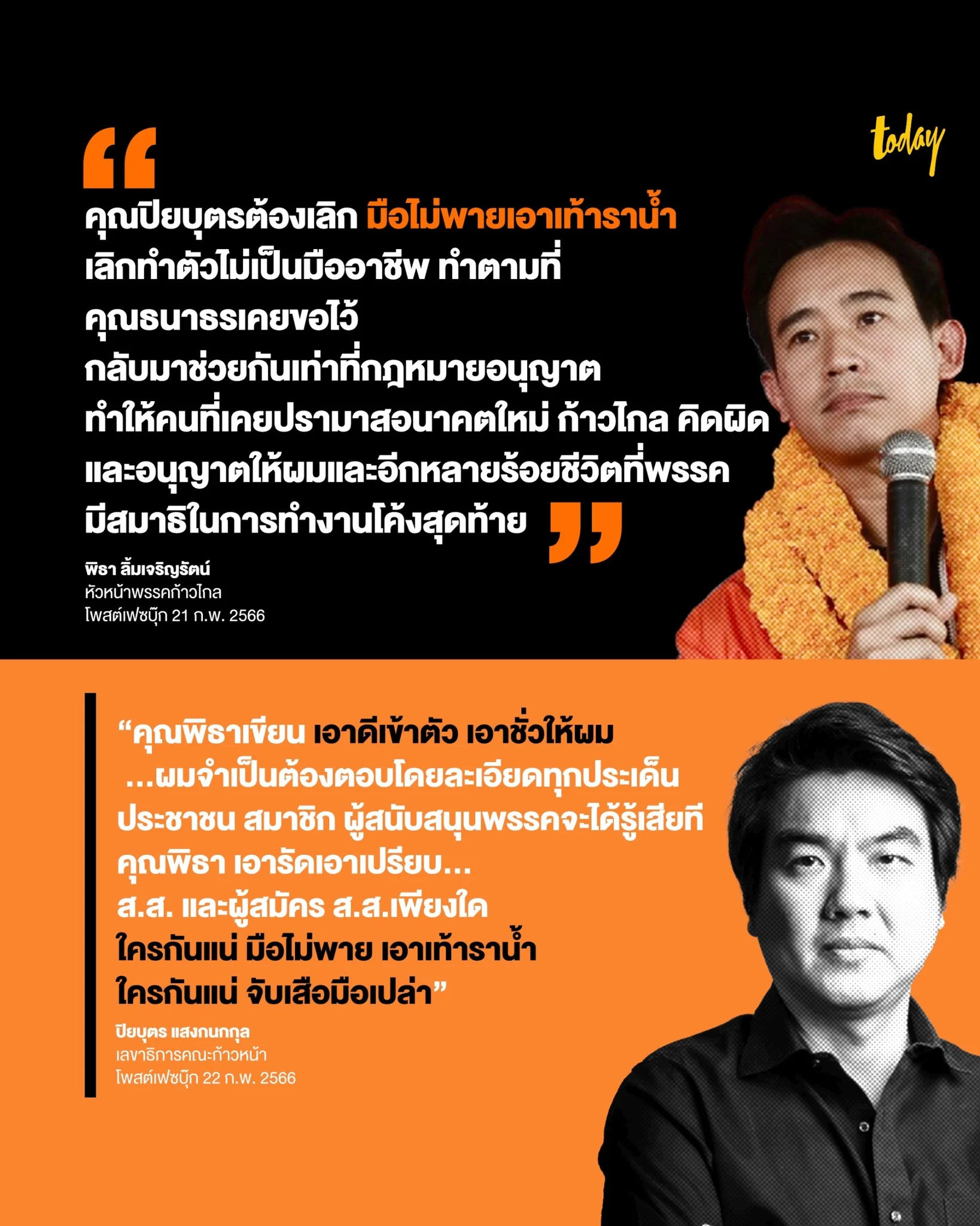 จบปัญหาความขัดแย้งผ่านโซเชียลระหว่าง ‘พิธา ลิ้มเจริญรัตน์’ และ ‘ปิยบุตร แสงกนกกุล’ หัวหน้าพรรคก้าวไกลโพสต์ระบุว่า ได้คุยกันแล้วปรับความเข้าใจกันได้ด้วยดี ยอมรับมีความเห็นต่าง แต่ยังมีอุดมการณ์ เป้าหมาย เดียวกัน จะเดินทางร่วมกันต่อไป