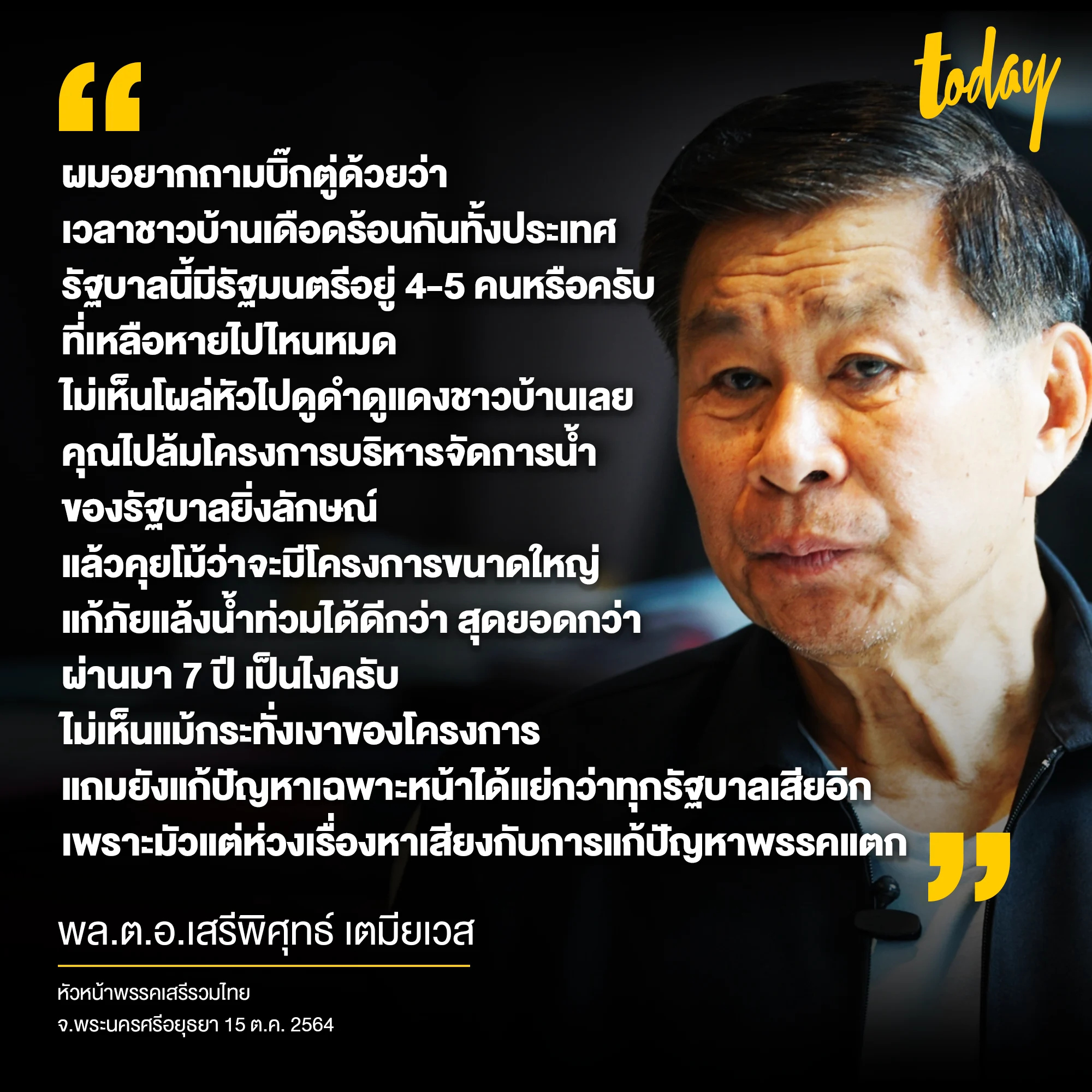 “ผมอยากถามบิ๊กตู่ด้วยว่า เวลาชาวบ้านเดือดร้อนกันทั้งประเทศ รัฐบาลนี้มีรัฐมนตรีอยู่ 4-5 คนหรือครับ ที่เหลือหายไปไหนหมด ไม่เห็นโผล่หัวไปดูดำดูแดงชาวบ้านเลย คุณไปล้มโครงการบริหารจัดการน้ำของรัฐบาลยิ่งลักษณ์ แล้วคุยโม้ว่าจะมีโครงการขนาดใหญ่แก้ภัยแล้งน้ำท่วมได้ดีกว่า สุดยอดกว่า ผ่านมา 7 ปี เป็นไงครับ ไม่เห็นแม้กระทั่งเงาของโครงการ แถมยังแก้ปัญหาเฉพาะหน้าได้แย่กว่าทุกรัฐบาลเสียอีก เพราะมัวแต่ห่วงเรื่องหาเสียงกับการแก้ปัญหาพรรคแตก” พล.ต.อ.เสรีพิศุทธ์กล่าว
