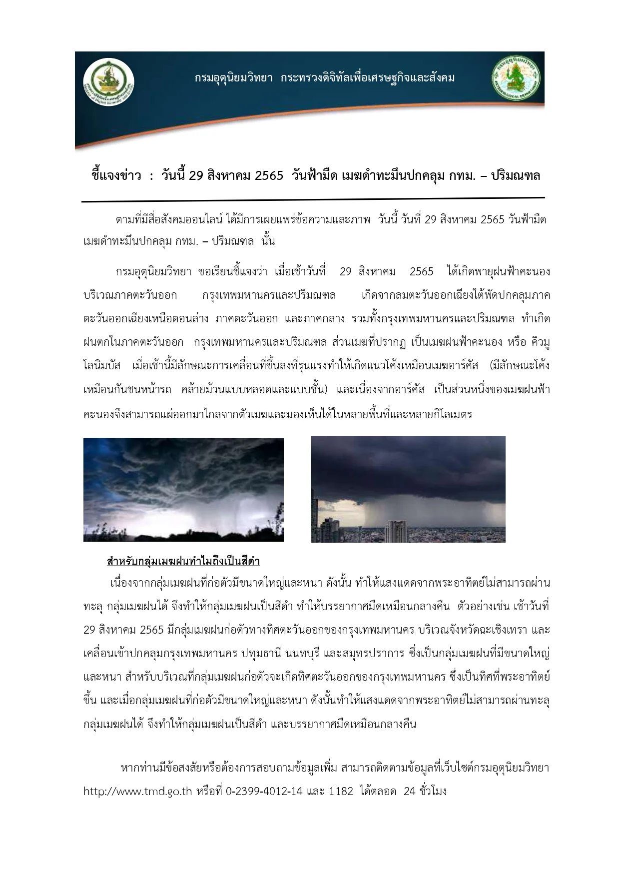 กรมอุตุนิยมวิทยา ชี้แจงกรณีเช้าวันนี้ (29 ส.ค.) เกิดพายุฝนฟ้าคะนองบริเวณภาคตะวันออก กรุงเทพมหานครและปริมณฑล ว่า เกิดจากลมตะวันออกเฉียงใต้พัดปกคลุมภาคตะวันออกเฉียงเหนือตอนล่าง ภาคตะวันออก และภาคกลาง รวมทั้งกรุงเทพมหานครและปริมณฑล ทำเกิดฝนตกในภาคตะวันออก กรุงเทพมหานครและปริมณฑล ส่วนเมฆที่ปรากฏเป็นเมฆฝนฟ้าคะนอง หรือ คิวมูโลนิมบัส เมื่อเช้านี้มีลักษณะการเคลื่อนที่ขึ้นลงที่รุนแรงทำให้เกิดแนวโค้งเหมือนเมฆอาร์คัส (มีลักษณะโค้งเหมือนกันชนหน้ารถ คล้ายม้วนแบบหลอดและแบบชั้น) และเนื่องจากอาร์คัส เป็นส่วนหนึ่งของเมฆฝนฟ้าคะนองจึงสามารถแผ่ออกมาไกลจากตัวเมฆและมองเห็นได้ในหลายพื้นที่และหลายกิโลเมตร