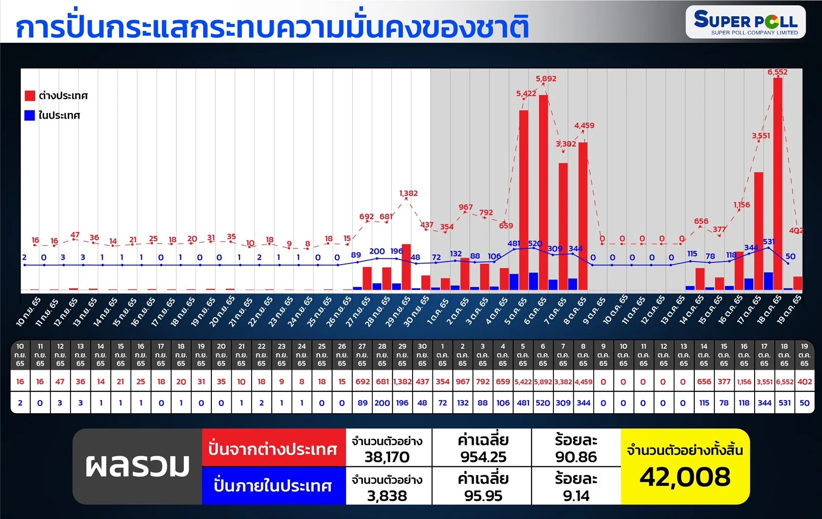 นอกจากนี้ เมื่อนำประเด็น ความจริงในโลกโซเชียลที่กระทบต่อความมั่นคงชาติ เช่น การยกเลิก ม. 112 การปลุกปั่นประเด็นที่นำไปสู่ความขัดแย้งรุนแรงบานปลายมาพิจารณา ได้พบแนวโน้มของการปลุกปั่นกระแสกระทบต่อความมั่นคงของชาติ เช่น ยกเลิก ม.112 และการปฏิรูปสถาบัน และอื่น ๆ พบว่า การปลุกปั่นกระแสกระทบความมั่นคงของชาติมีจำนวนตัวอย่างที่เก็บรวบรวมมาจากโลกโซเชียลทั้งภายในประเทศและต่างประเทศทั้งสิ้น 42,008 ตัวอย่าง พบว่า จำนวน 38,170 ตัวอย่างหรือร้อยละ 90.86 เป็นการปั่นมาจากต่างประเทศ เพื่อกระทบต่อความมั่นคงของชาติ ในขณะที่ จำนวน 3,838 ตัวอย่างหรือร้อยละ 9.14 ปั่นภายในประเทศโดยมีค่าเฉลี่ยจำนวนครั้งของการปั่นจำนวน 95.95 ครั้งในช่วงระยะเวลาประมาณ 30 กว่าวันที่ผ่านมา