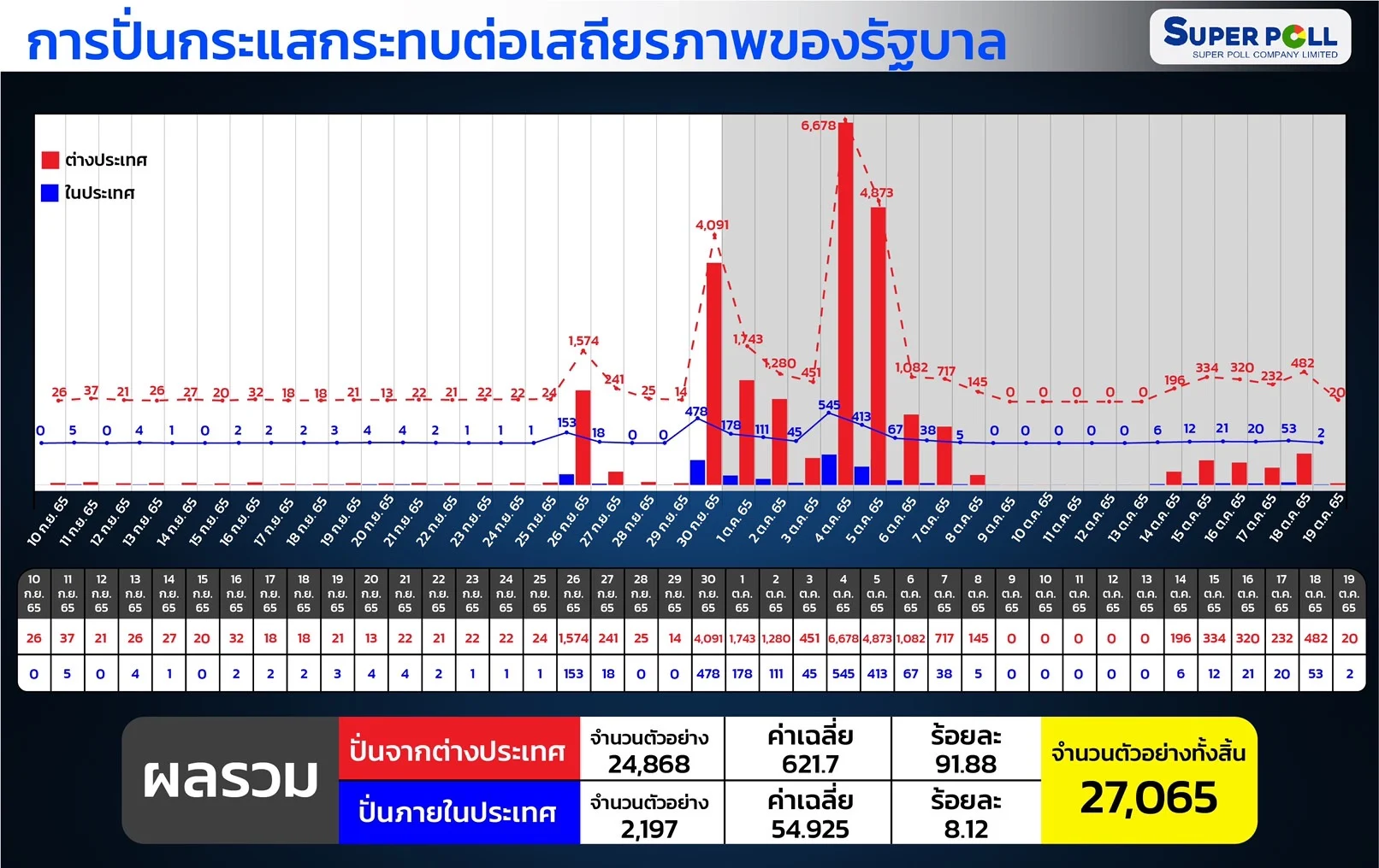 ประเด็นที่น่าพิจารณาคือ ความจริงในโลกโซเชียลทางการเมืองในการศึกษาครั้งนี้คือ การปลุกปั่นกระแสกระทบเสถียรภาพของรัฐบาล มีจำนวนตัวอย่างที่เก็บรวบรวมมาจากโลกโซเชียลทั้งภายในประเทศและต่างประเทศทั้งสิ้น 27,065 ตัวอย่าง พบว่า จำนวน 24,868 ตัวอย่างหรือร้อยละ 91.88 เป็นการปั่นมาจากต่างประเทศ เพื่อกระทบต่อเสถียรภาพของรัฐบาลเช่น ไล่ประยุทธ์ ประยุทธ์ออกไป ในขณะที่ จำนวน 2,197 ตัวอย่างหรือร้อยละ 8.12 ปั่นภายในประเทศโดยมีค่าเฉลี่ยจำนวนครั้งของการปั่นจำนวน 621.7 ครั้งในช่วงระยะเวลาประมาณ 30 กว่าวันที่ผ่านมา