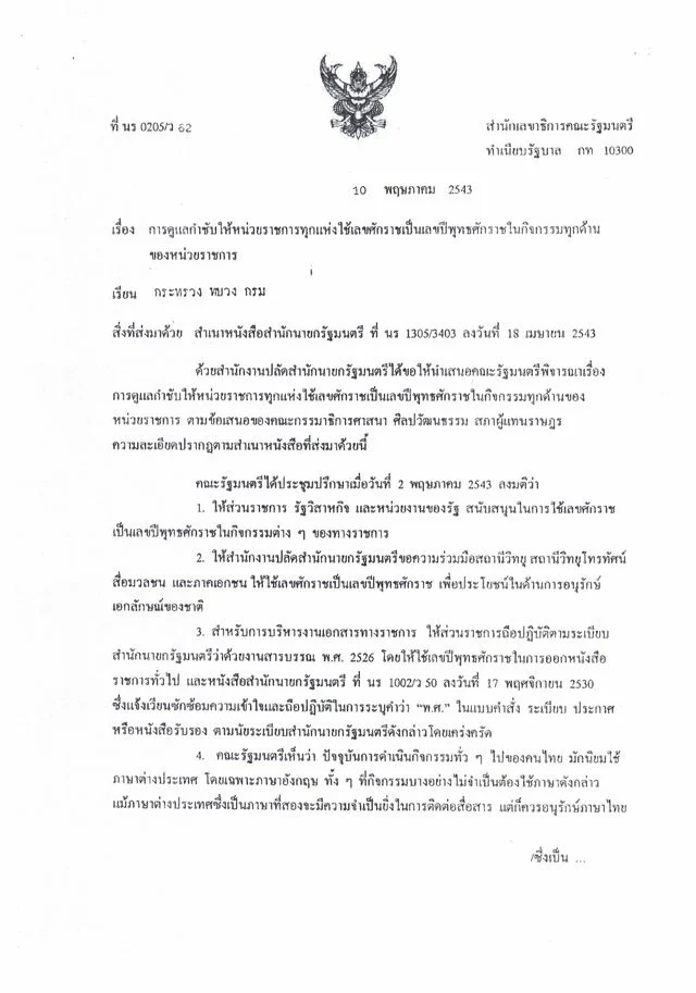 จากการอ้างอิงเรื่องการใช้เลขไทย เฟซบุ๊กของงานสารบรรณและการเขียนหนังสือราชการระบุไว้ เมื่อวันที่ 31 พ.ค. 2563 ว่า เรื่องการใช้เลขไทยในงานราชการเป็นไปตามนัยมติคณะรัฐมนตรีเมื่อวันที่ 2 พฤษภาคม 2543 ซึ่งขอความร่วมมือให้ส่วนราชการไทยใช้เลขศักราชเป็นเลขปีพุทธศักราชในกิจกรรมทุกด้านของหน่วยงานราชการ เพื่อเป็นการส่งเสริมการใช้เลขไทย