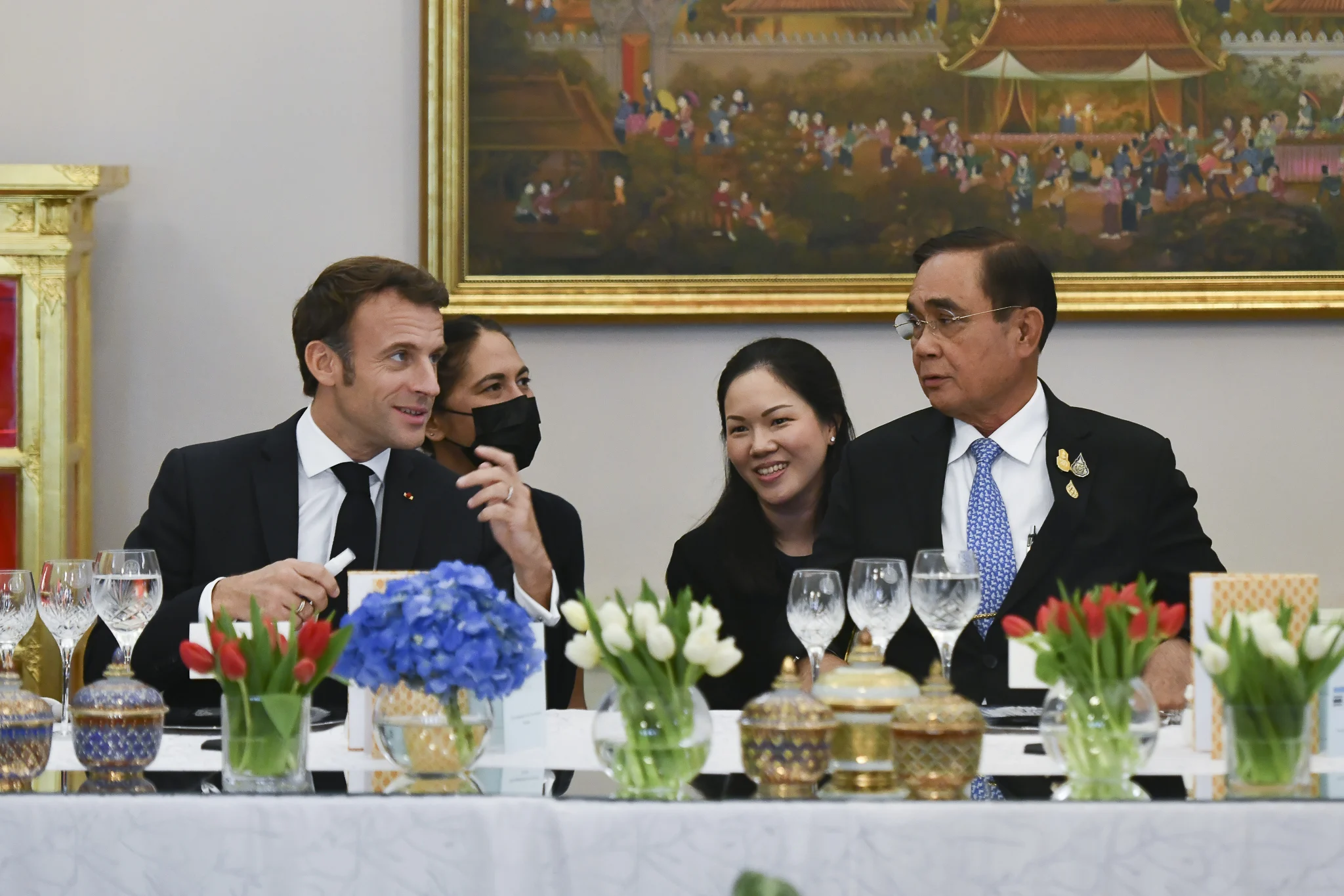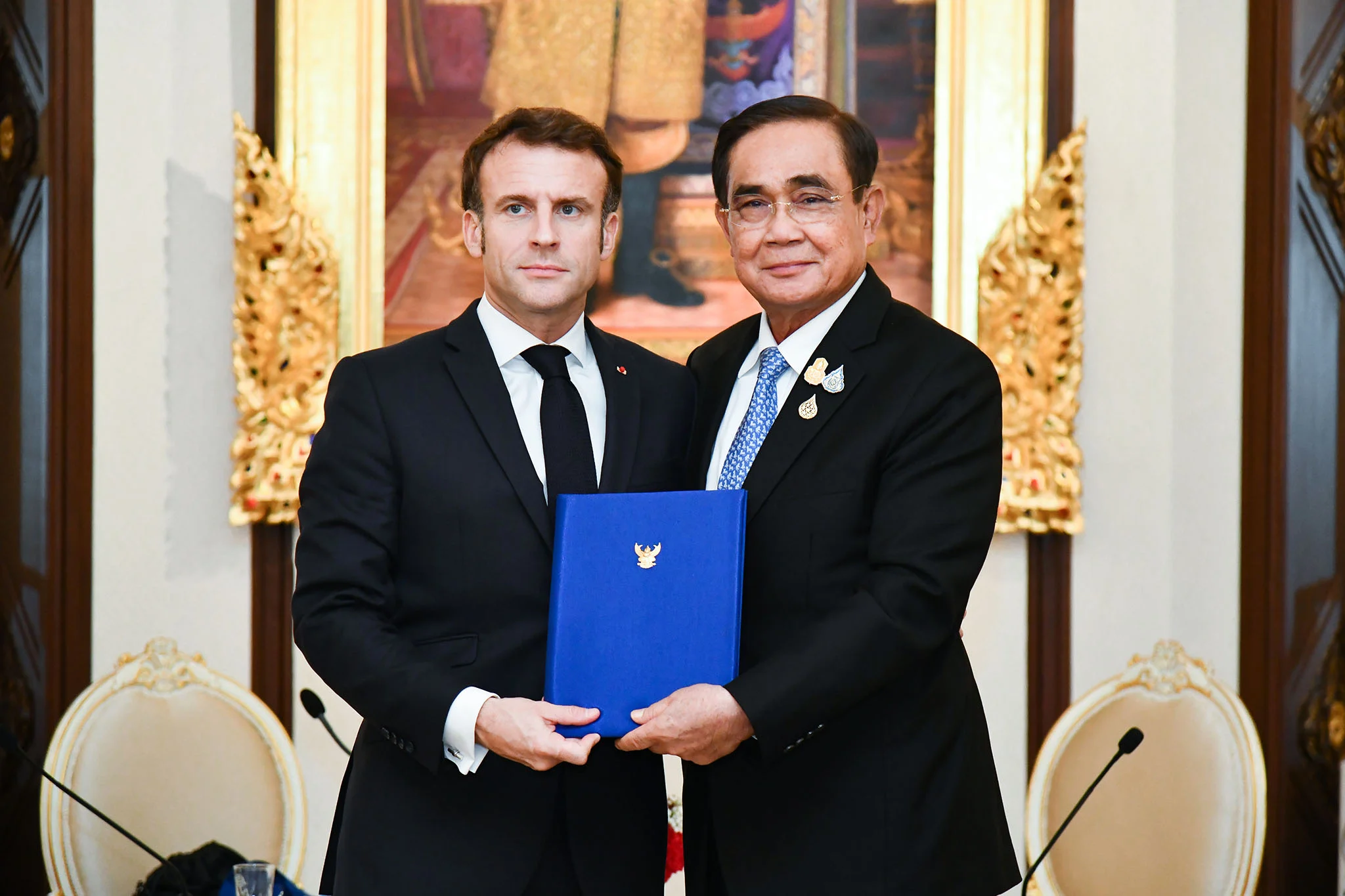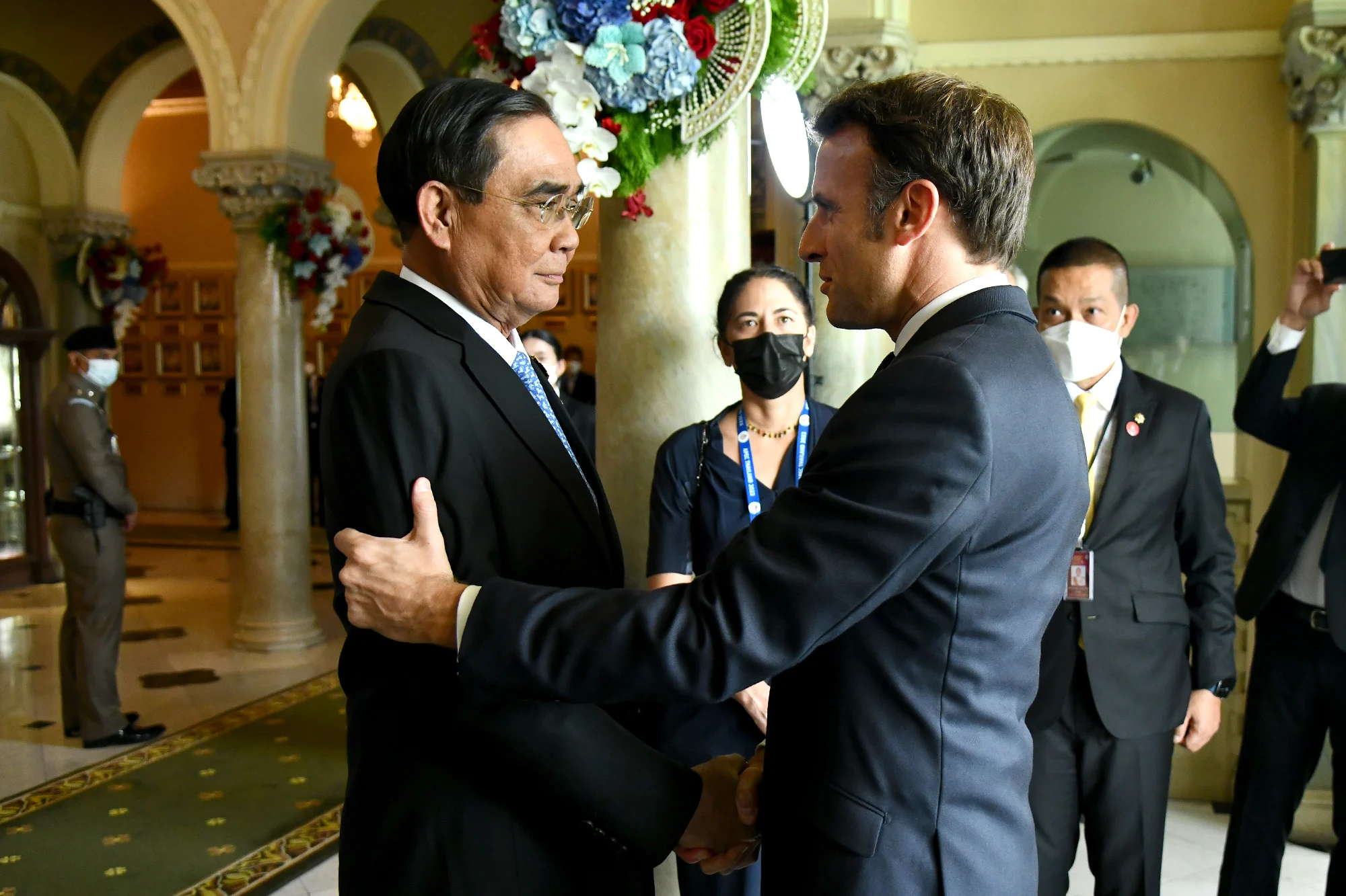 ประธานาธิบดีฝรั่งเศส ขอบคุณนายกรัฐมนตรีที่ให้การต้อนรับเป็นอย่างดี พร้อมทั้งชื่นชมความร่วมมือระหว่างไทยกับฝรั่งเศสที่มีความคืบหน้าในหลายๆ ด้าน แม้ในช่วงสถานการณ์โควิด-19 โดยเฉพาะความร่วมมือด้านอวกาศ ในการพัฒนาดาวเทียมธีออส 2 โอกาสนี้ ประธานาธิบดีฝรั่งเศสชื่นชมนายกรัฐมนตรีและประเทศไทยในโอกาสการเป็นเจ้าภาพการประชุม APEC 2022 โดยประเด็นความร่วมมือของ APEC ในแง่การค้าและการลงทุน การรักษาสันติภาพ และสิ่งแวดล้อม เป็นประเด็นที่สอดคล้องกับสิ่งที่ฝรั่งเศสต้องการผลักดัน ยืนยันสนับสนุนประเด็นที่ไทยต้องการผลักดัน