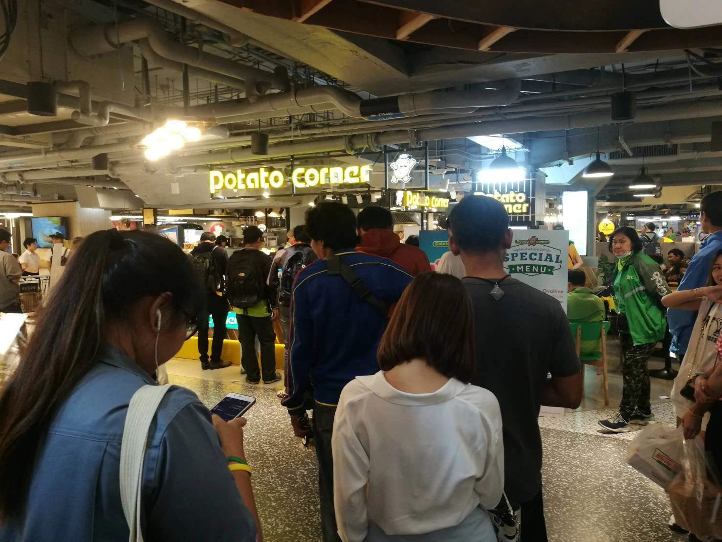 คนแห่เข้าคิวซื้อ Potato Corner สาขาเซ็นทรัลลาดพร้าว เย็นวันพุธที่ 21 สิงหาคม 2562 หลังพีช พชร ให้สัมภาษณ์หนึ่งวัน