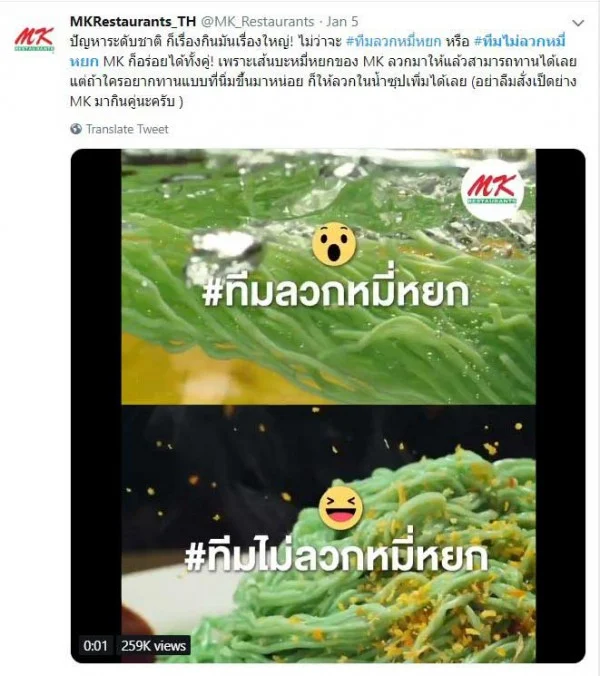 ถึงแม้กระแสดังกล่าว ‘MK Restaurant’ จะไม่ได้สร้างขึ้นมาเองแต่ก็ไม่พลาดโอกาสที่จะทำการตลาดแบบเรียลไทม์โดยการโพสต์ข้อความว่า‘ปัญหาระดับชาติ ก็เรื่องกินมันเรื่องใหญ่! ไม่ว่าจะ #ทีมลวกหมี่หยก หรือ #ทีมไม่ลวกหมี่หยก MK ก็อร่อยได้ทั้งคู่! เพราะเส้นบะหมี่หยกของ MK ลวกมาให้แล้วสามารถทานได้เลย แต่ถ้าใครอยากทานแบบที่นิ่มขึ้นมาหน่อย ก็ให้ลวกในน้ำซุปเพิ่มได้เลย (อย่าลืมสั่งเป็ดย่าง MK มากินคู่นะครับ)’ พร้อมภาพเคลื่อนไหวของหมี่หยกทั้งในรูปแบบที่ลวกและไม่ลวก