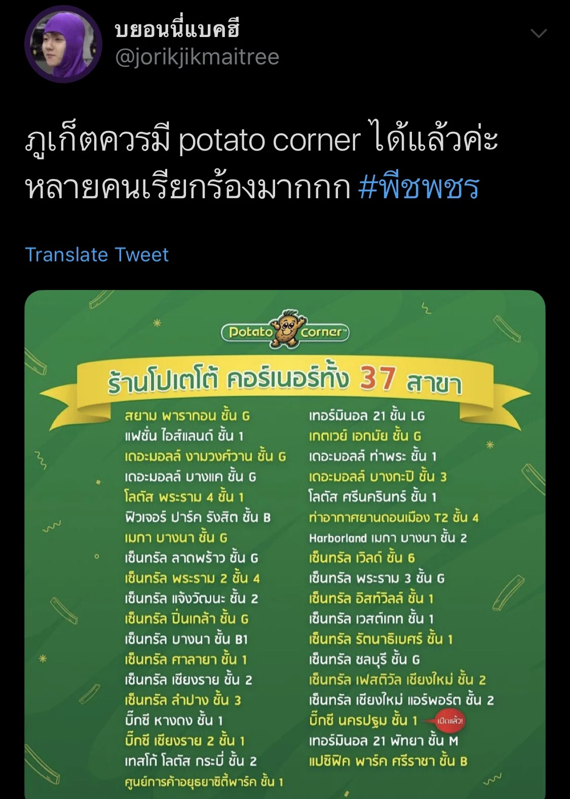 #พีชพชร และ แฮชแท็กที่เกี่ยวข้องกับการแถลงข่าวของ พีช พชร จิราธิวัฒน์ ปมความสัมพันธ์กับอดีตแฟนสาว แพทริเซีย กู๊ด กลายเป็นกระแสในโลกออนไลน์ตลอดวันที่ 20 สิงหาคม ต่อเนื่องถึงวันรุ่งขึ้น ขนาบข้างมากับการพูดถึงการทำการตลาดแบบเรียลไทม์ของ Potato Corner – กลายเป็นอีกหนึ่งกรณีศึกษาทางการตลาดที่น่าสนใจ