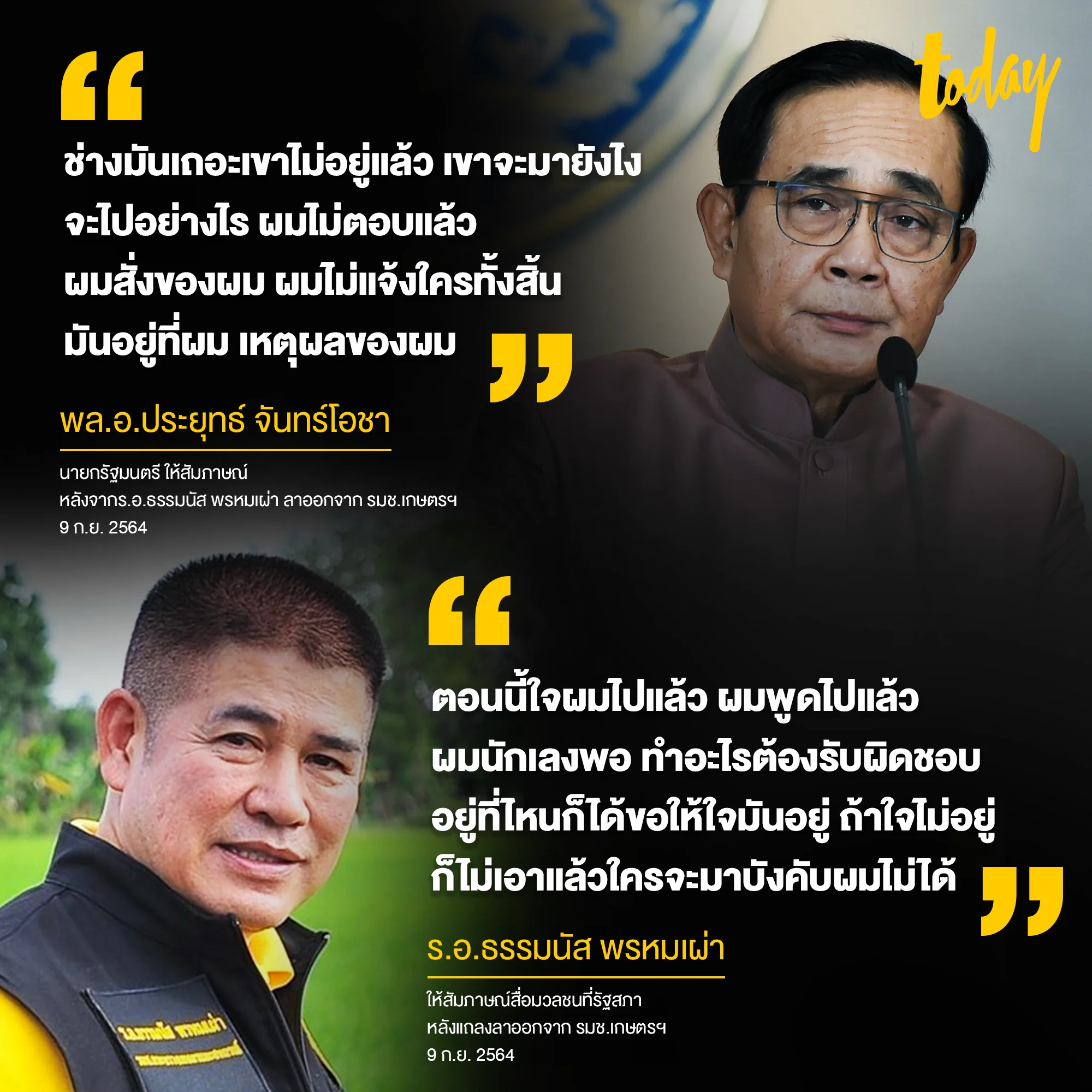 ร.อ. ธรรมนัส พรหมเผ่า ได้แถลงข่าวการลาออกจากรัฐมนตรีช่วยว่าการกระทรวงเกษตรและสหกรณ์ ว่า ผมต้องการทำงานอื่นที่เข้มแข็งเพื่อประเทศชาติบ้านเมืองจริงๆ ไม่ใช่มารองรับหรือทำอะไรเพื่อคนบางกลุ่ม ที่ผ่านมาผมปรึกษาครอบครัวมาหลายวันแล้ว ได้ข้อยุติว่าผมจะลาออกจากรมช.เกษตรฯ ซึ่งได้ลงนามไว้ตั้งแต่เมื่อวันที่ 8 ก.ย. และตั้งใจว่าจะยื่นเอกสารตั้งแต่เมื่อวานนี้ (8 ก.ย.) แล้ว แต่เลขาฯของผม เข้าใจผิดว่าจะยื่นวันนี้ ท้ายที่สุดขอแจ้งประชาชนทุกจังหวัดว่า วันนี้ผมตัดสินใจแล้วว่า ผมจะเลือกเส้นทางการเดินของผมใหม่ ยึดหลักผลประโยชน์ของประเทศ และประชาชนเป็นที่ตั้ง