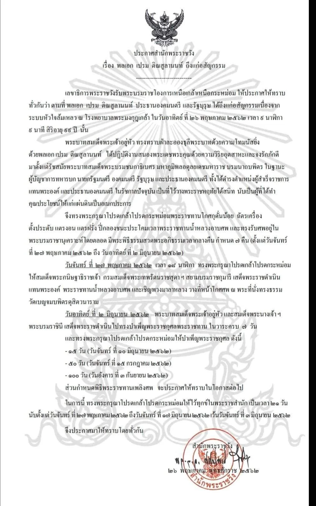 เลขาธิการพระราชวังรับพระบรมราชโองการเหนือเกล้าเหนือกระหม่อม ให้ประกาศให้ทราบทั่วกันว่า ตามที่ พลเอก เปรม ติณสูลานนท์ ประธานองคมนตรี และรัฐบุรุษ ได้ถึงแก่อสัญกรรม เนื่องจากระบบหัวใจล้มเหลว ณ โรงพยาบาลพระมงกุฎเกล้า ในวันอาทิตย์ ที่ 26 พฤษภาคม 2562 เวลา 9 นาฬิกา 9 นาที สิริอายุ 99 ปีนั้น