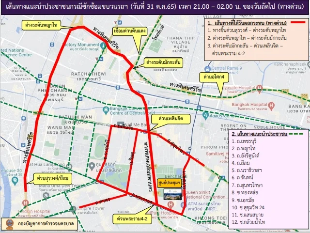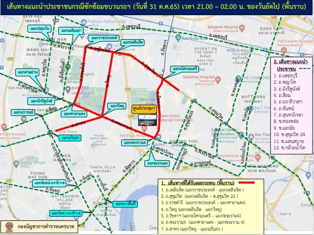กองบัญชาการตำรวจนครบาล (บช.น.) ประชาสัมพันธ์ เส้นทางแนะนำประชาชน กรณีซักซ้อมขบวนรถฯ สำหรับการประชุมเอเปค ซึ่งปีนี้ประเทศไทยเป็นเจ้าภาพ โดยคืนนี้ (31 ต.ค. 65) เวลา 21.00 น. ถึง 02.00 น. ของวันที่ 1 พ.ย. 65 จะมีการซักซ้อมชบวนรถฯ ดังกล่าว