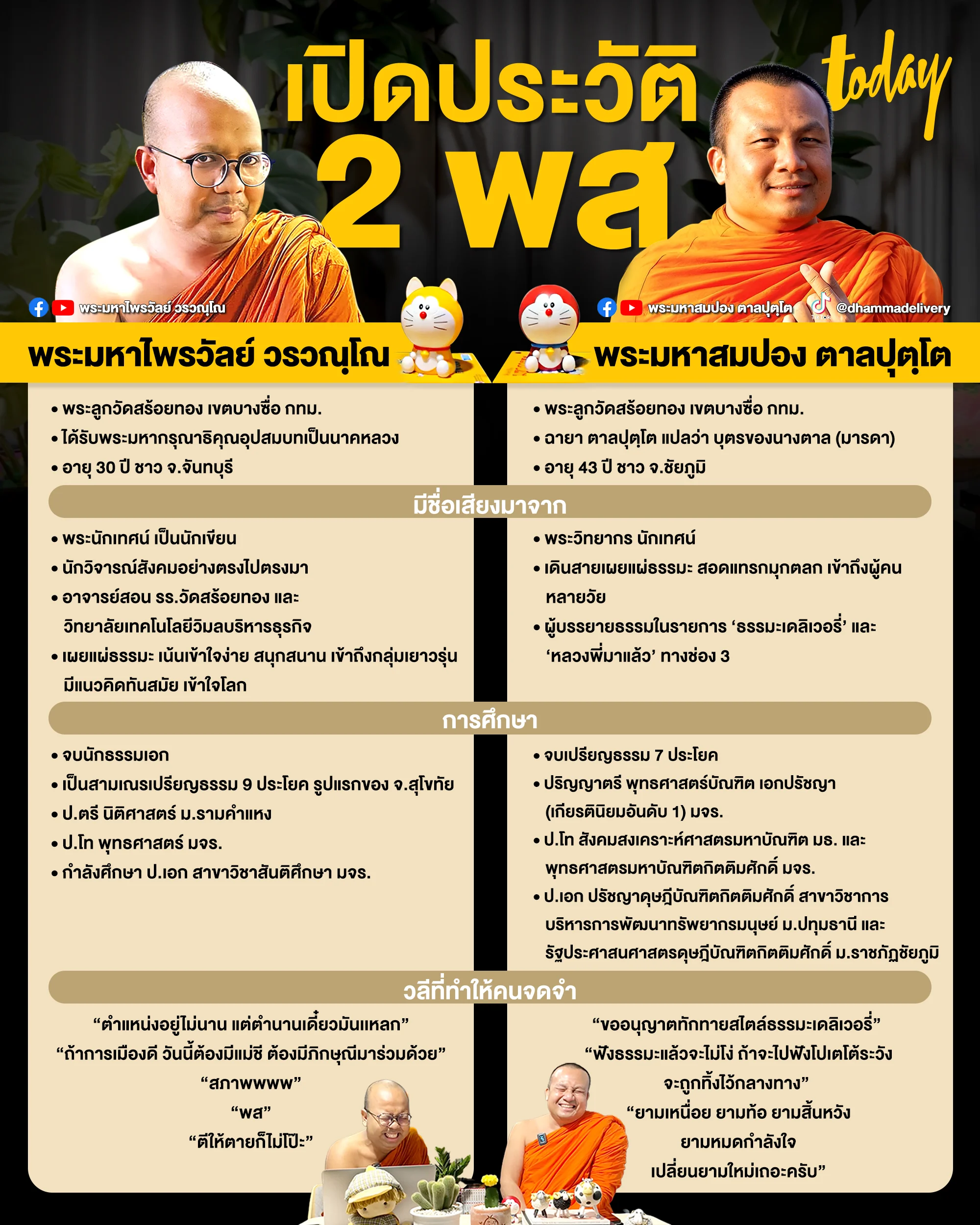 นาทีนี้ไม่มีใครไม่รู้จัก 2 พระนักเทศน์ชื่อดังจากวัดสร้อยทองพระอารามหลวง หลังเป็นกระแสในโลกออนไลน์จากการออกมาแสดงเทศนาธรรมผ่านการไลฟ์เฟซบุ๊ก ที่มีคนดูเข้าชมมากสุด 2 แสนคน เพราะด้วยลีลา ภาษา ความตลก ที่สอดแทรกธรรมะ ที่เข้าถึงคนรุ่นใหม่ และก่อนจะมาเป็นขวัญใจชาวโซเชียลพระทั้ง 2 รูป ทำอะไรกันมาบ้าง workpointTODAY รวบรวมประวัติแบบจึ้งๆ มาไว้ให้ดูที่น