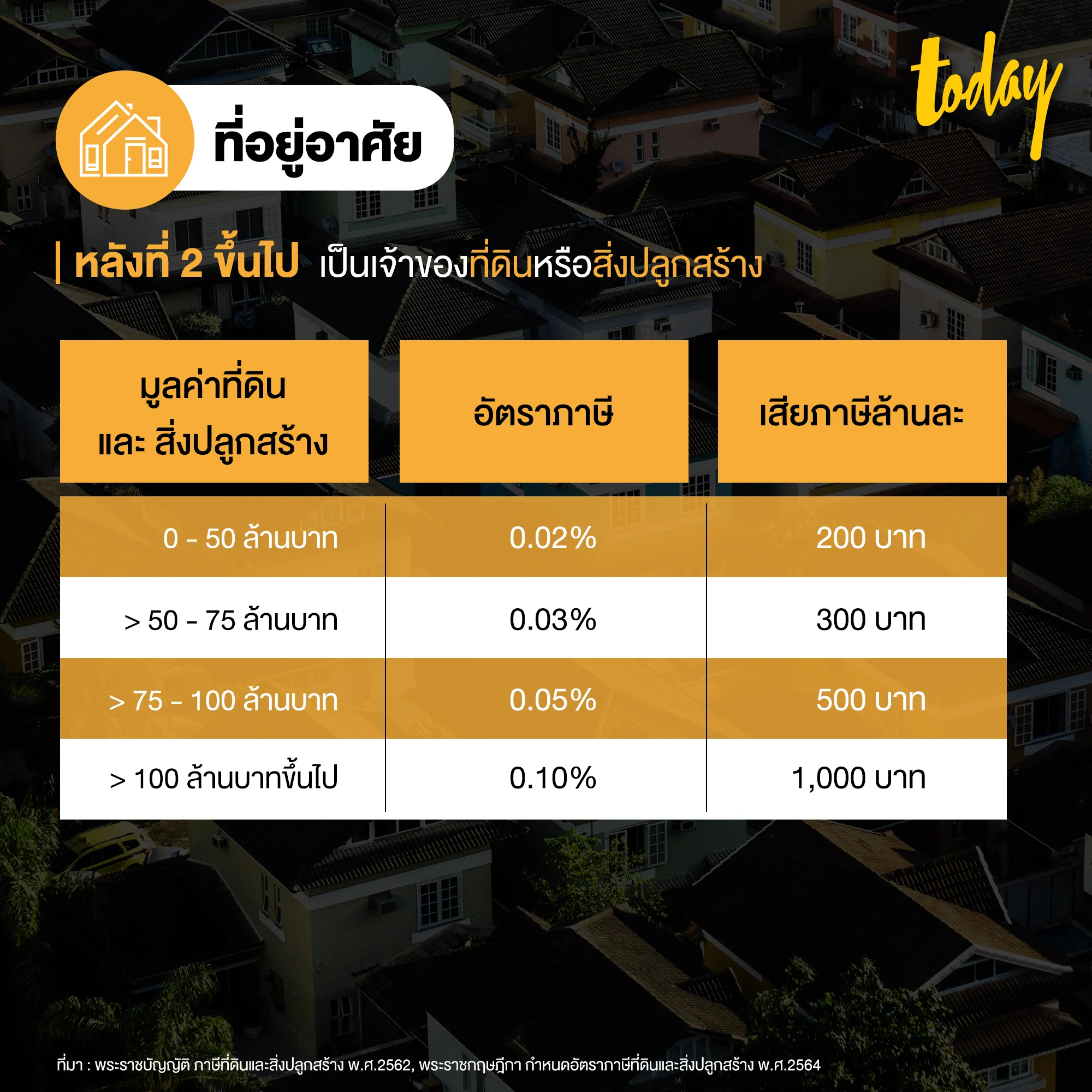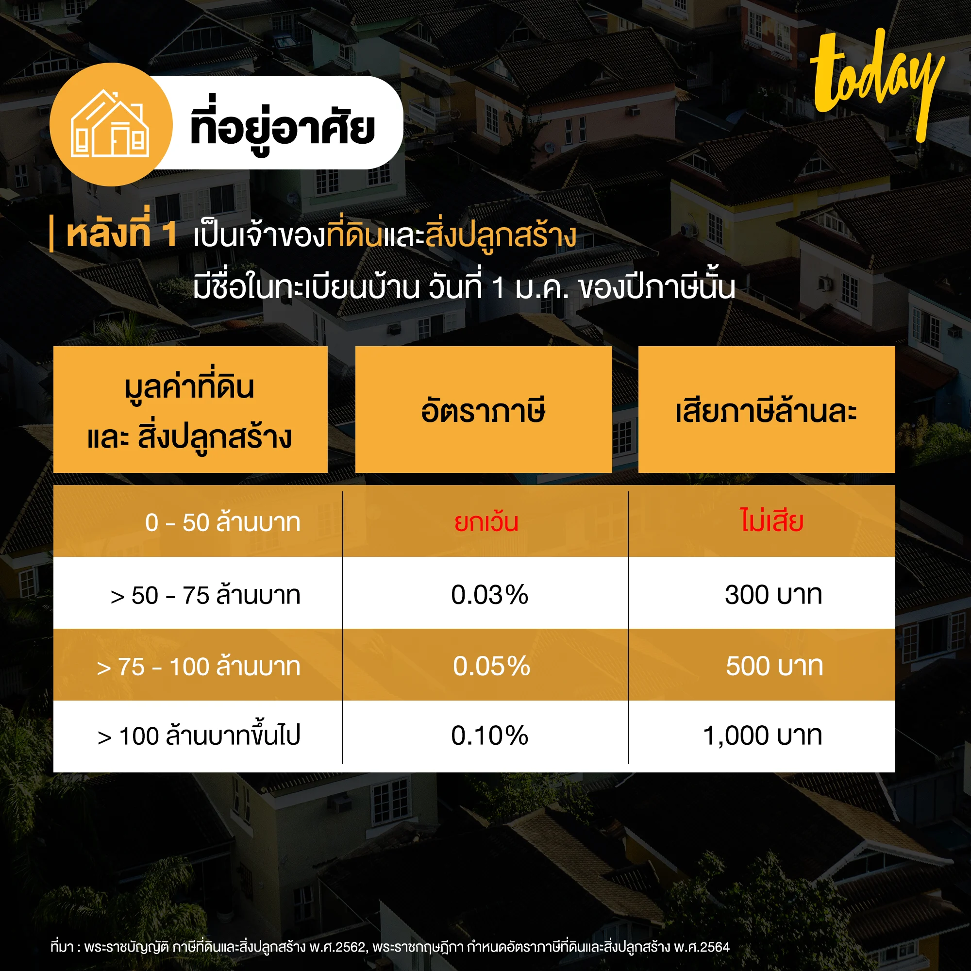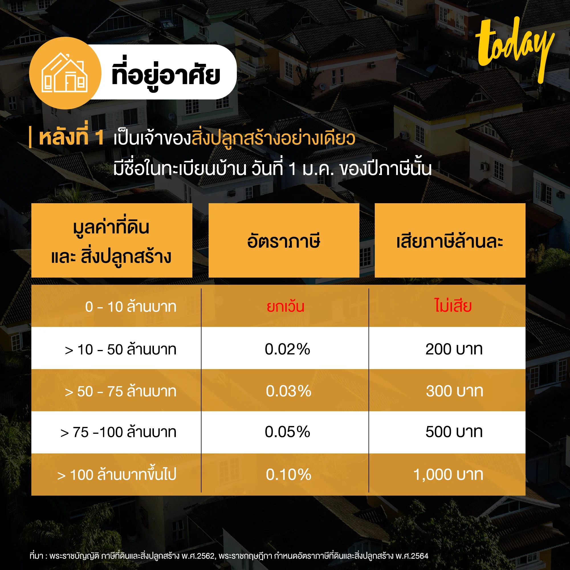 1.1 ที่อยู่อาศัย หลังที่หนึ่ง : เป็นเจ้าของที่ดินและสิ่งปลูกสร้างที่ใช้สำหรับอยู่อาศัย และต้องมีชื่อในทะเบียนบ้าน ในวันที่ 1 ม.ค. ของปีภาษีนั้น จะเสียภาษีตามอัตราด้านล่างนี้