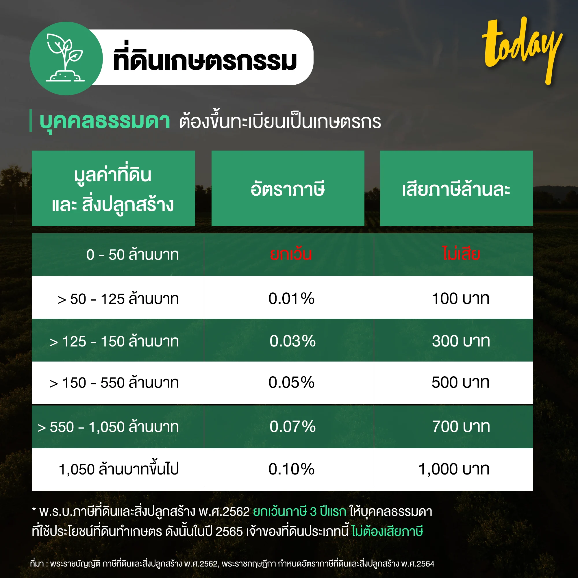 2.1 ที่ดินเกษตรกรรม ของบุคคลธรรมดา : ต้องขึ้นทะเบียนเป็นเกษตรกร จะเสียภาษีตามอัตราด้านล่างนี้