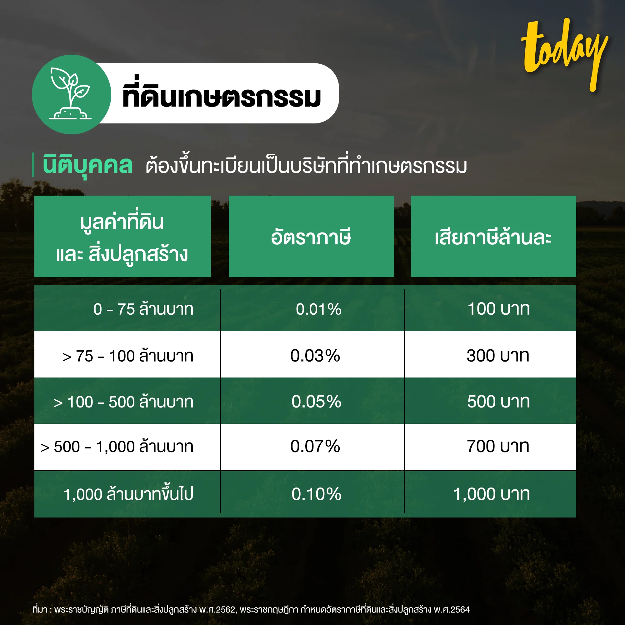 2.2 ที่ดินเกษตรกรรม ไม่ใช่ของบุคคลธรรมดา : เช่น บริษัท ต้องขึ้นทะเบียนเป็นบริษัทที่ทำเกษตรกรรม จะเสียภาษีตามอัตราด้านล่างนี้