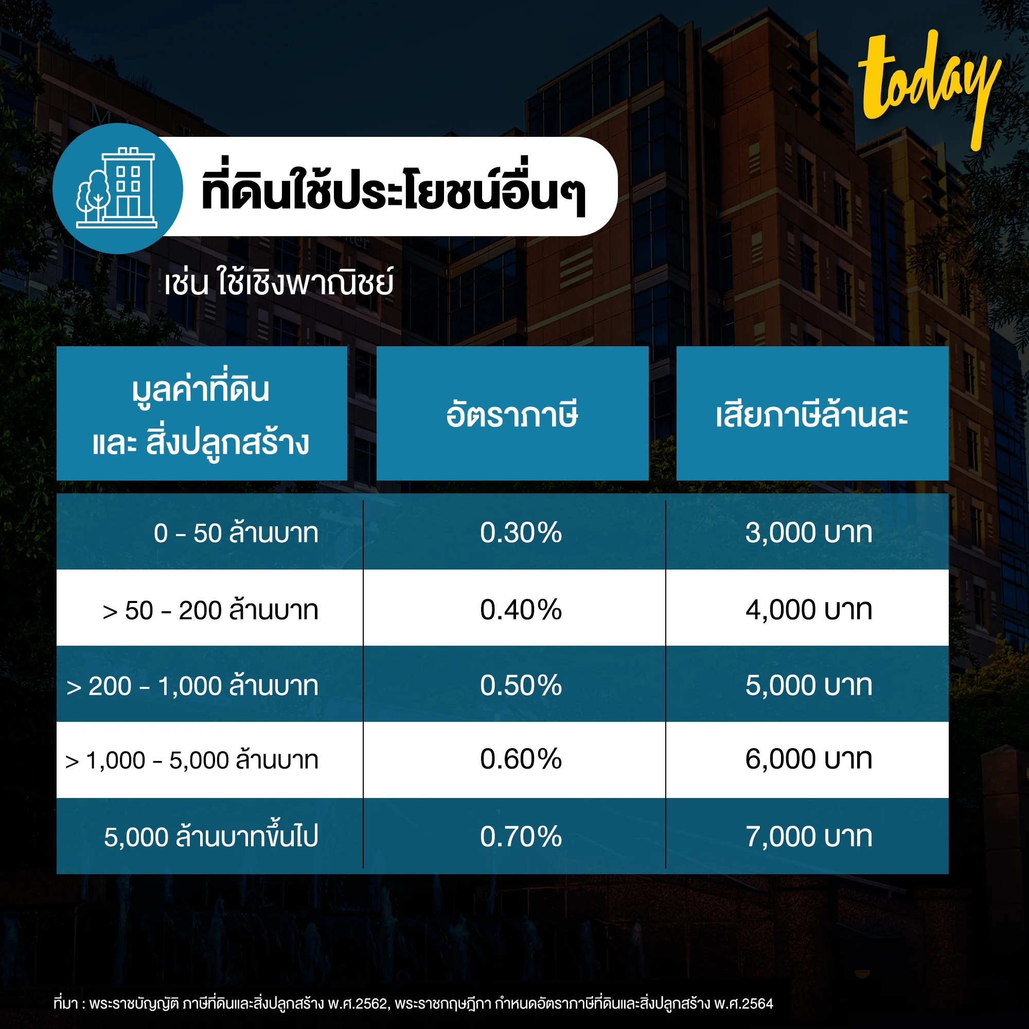 - ฐานภาษีของที่ดินหรือสิ่งปลูกสร้าง x อัตราภาษี = ภาษีที่ต้องเสีย