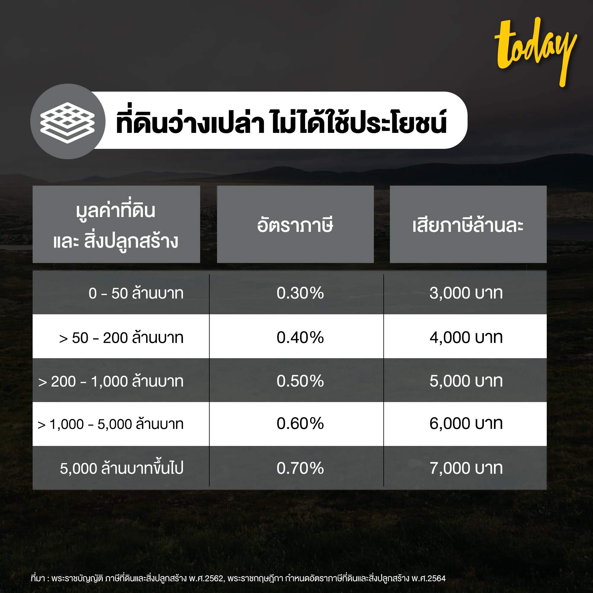 workpointTODAY สรุปอัตราภาษีที่ดินและสิ่งปลูกสร้าง ปีภาษี 2565 ของที่ดินและสิ่งปลูกสร้างแต่ละประเภท ได้แก่ ที่อยู่อาศัย ที่ดินเกษตรกรรม ที่ดินใช้ประโยชน์อื่นๆ และที่ดินว่างเปล่า มาให้อ่านกันแบบง่ายๆ ในบทความเดียว