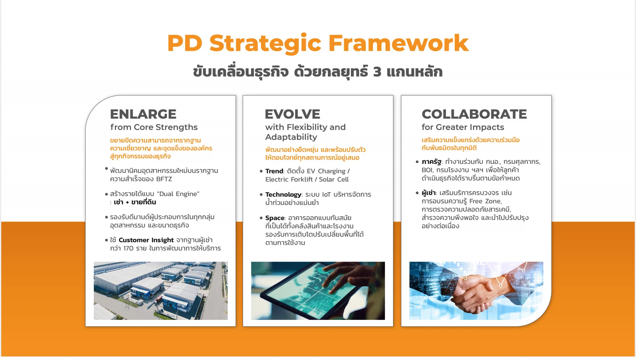 - ยกระดับแบรนด์ PD เป็นผู้นำอสังหาฯ อุตสาหกรรม ที่พร้อมรองรับผู้ประกอบการในทุกกลุ่ม