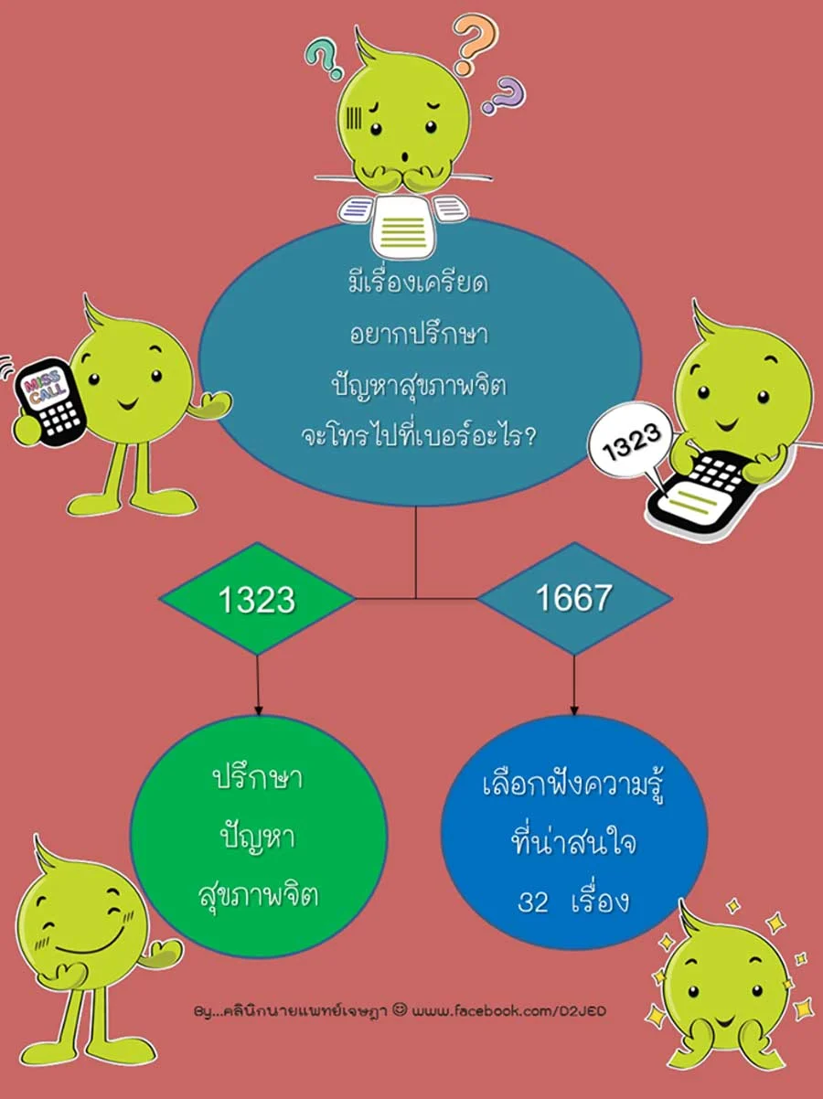 1) โทร. 1323 สายด่วนสุขภาพจิต เป็นเบอร์สำหรับพูดคุยปรึกษา