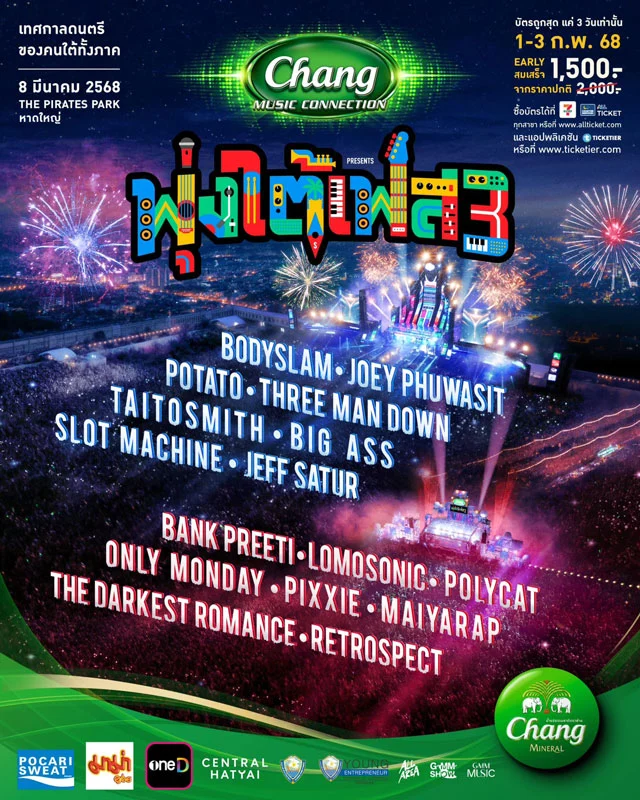 ห้ามพลาด!1ปีมีครั้งเดียว รวมพลังชาวใต้ให้เป็นหนึ่ง แล้วมากระโดดกับเสียงเพลงกลางเมืองหาดใหญ่ ไปด้วยกันกับเทศกาลดนตรีของชาวใต้ทั้งภาค Chang Music Connection presents“พุ่งใต้เฟส 3” จัดขึ้นในวันเสาร์ที่ 8 มี.ค. 2568 สวนน้ำ เดอะไพเรท ปาร์ค หาดใหญ่ (The Pirates Park Hatyai) จำหน่ายราคาพิเศษถูกที่สุด 3 วันเท่านั้น!!! 1-3 กุมภาพันธ์ 2568 บัตร Early สมเสร็จ ราคา 1,500 บาท (จากปกติ 2,000 บาท)ที่ www.allticket.com และ เคาน์เตอร์เซอร์วิส All Ticket ในร้าน 7-Eleven ทุกสาขาทั่วประเทศ และที่ www.TICKETIER.com หรือแอปพลิเคชั่น TICKETIER และสามารถติดตามรายละเอียดเพิ่มเติมได้ที่ FB / IG / TikTok / X : @PoongTaiFest #พุ่งใต้เฟส #GMMShow #AllArea