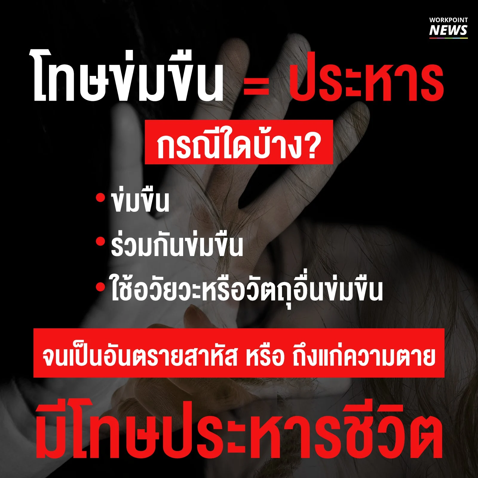 - ความผิดมาตรา 276 วรรค 1 ผู้ใดข่มขืนกระทำชำเราผู้อื่นโดยขู่เข็ญด้วยประการใด ๆ โดยใช้กำลังประทุษร้ายโดยผู้อื่นนั้นอยู่ในภาวะที่ไม่สามารถขัดขืนได้