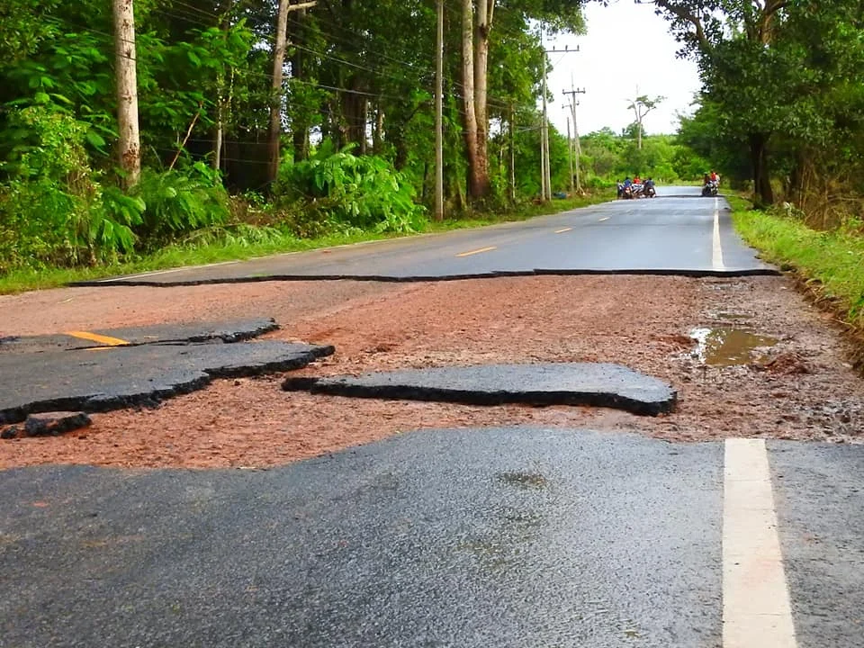 ชาวบ้านใน อ.ชานุมาน จ.อำนาจเจริญ รอเจ้าหน้าที่เข้าซ่อมแซมพื้นถนนลาดยาง ที่หลุดร่อนออกมาเป็นแผ่นหลังน้ำท่วมลดลง
