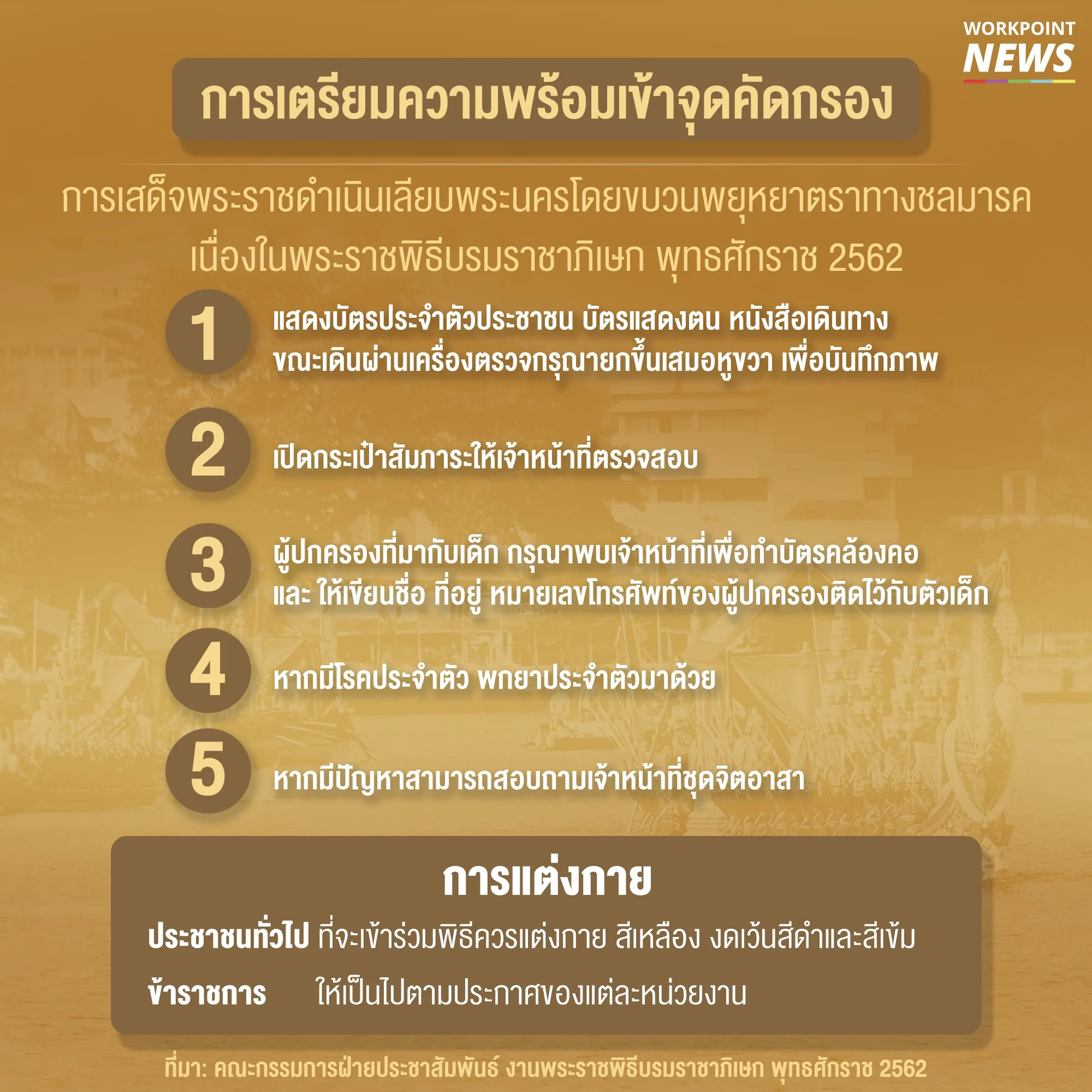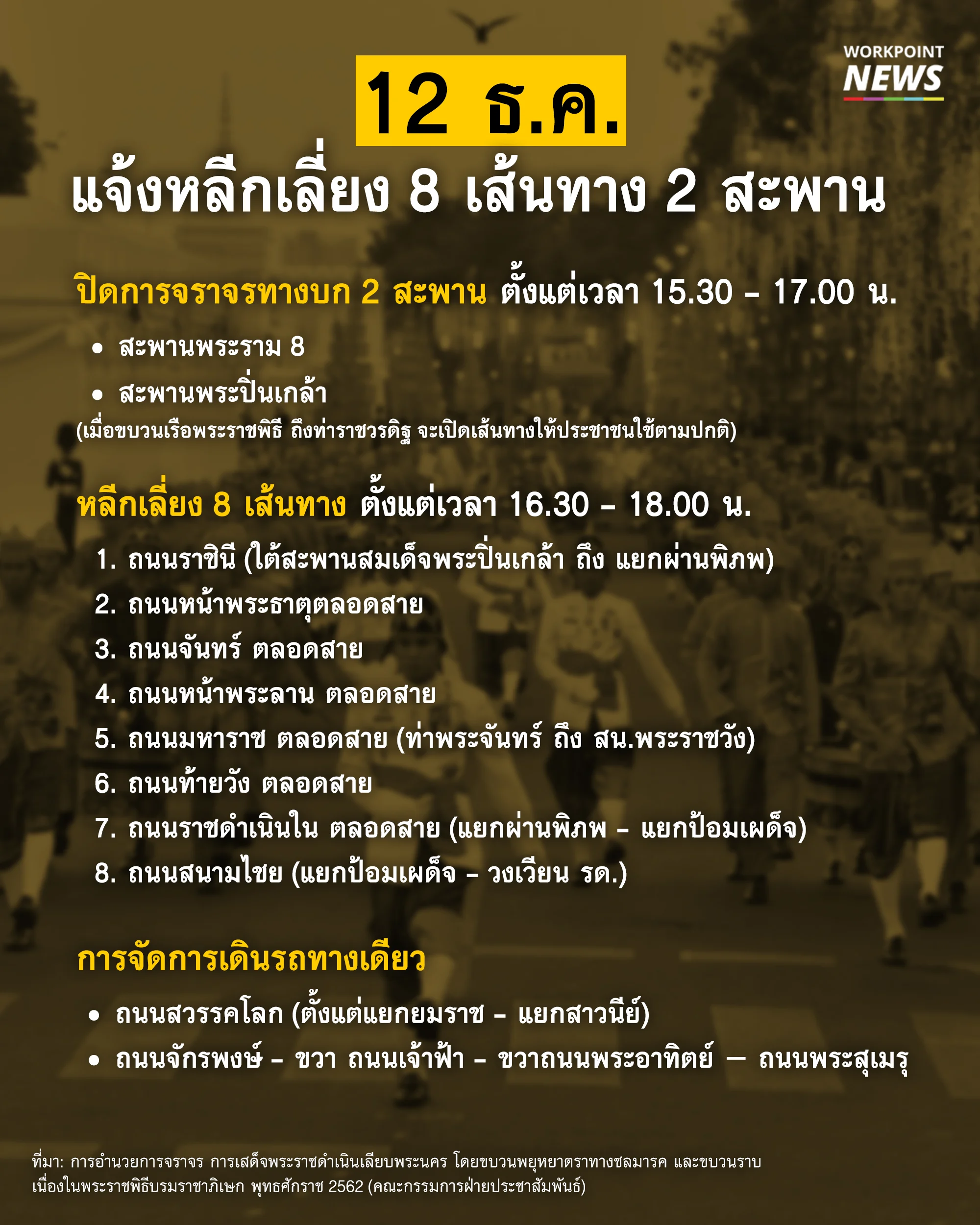 เมื่อวันที่ 9 ธ.ค.2562 ที่กระทรวงกลาโหม กองอำนวยการร่วมงานพระราชพิธีบรมราชาภิเษก (กอร.พระราชพิธีฯ) พล.ต.ต.จีรสันติ์ แก้วแสงเอก รองผู้บัญชาการตำรวจนครบาล ร่วมกับ นายสุระชัย เอี่ยมวชิรสกุล ผู้อำนวยการองค์การขนส่งมวลชนกรุงเทพ แถลงผลการประชุม การอำนวยความสะดวกประชาชนที่จะมาร่วมงานพระราชพิธีบรมราชาภิเษก ว่า รัฐบาลได้เพิ่มประสิทธิภาพในการอำนวยความสะดวกให้กับประชาชนในการเส้นทางการจราจร การเดินทาง จุดจอดรถ จุดคัดกรอง การให้บริการทางการแพทย์ อาหาร น้ำดื่ม จุดบริการรถสุขาเคลื่อนที่ และการเตรียมตัวประชาชนในการเฝ้าทูลละอองธุลีพระบาทรับเสด็จพระบาทสมเด็จพระเจ้าอยู่หัว สมเด็จพระนางเจ้าฯ พระบรมราชินี การเสด็จพระราชดำเนินเลียบพระนครโดยขบวนพยุหยาตราทางชลมารค และขบวนราบ เนื่องในพระราชพิธีบรมราชาภิเษก พุทธศักราชการ 2562 ดังนี้