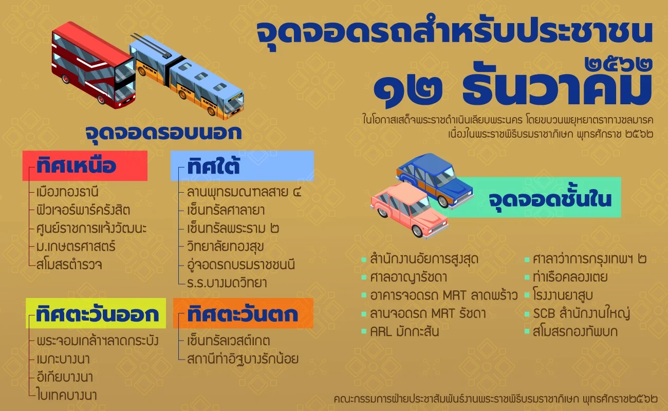 องค์การขนส่งมวลชนกรุงเทพ (ขสมก.) จัดเตรียมจุดจอดรถสี่มุมเมืองเพื่อรองรับรถยนต์ส่วนบุคคล และอำนวยความสะดวกประชาชนเข้าสู่พื้นที่ชั้นในการจัดพระราชพิธี