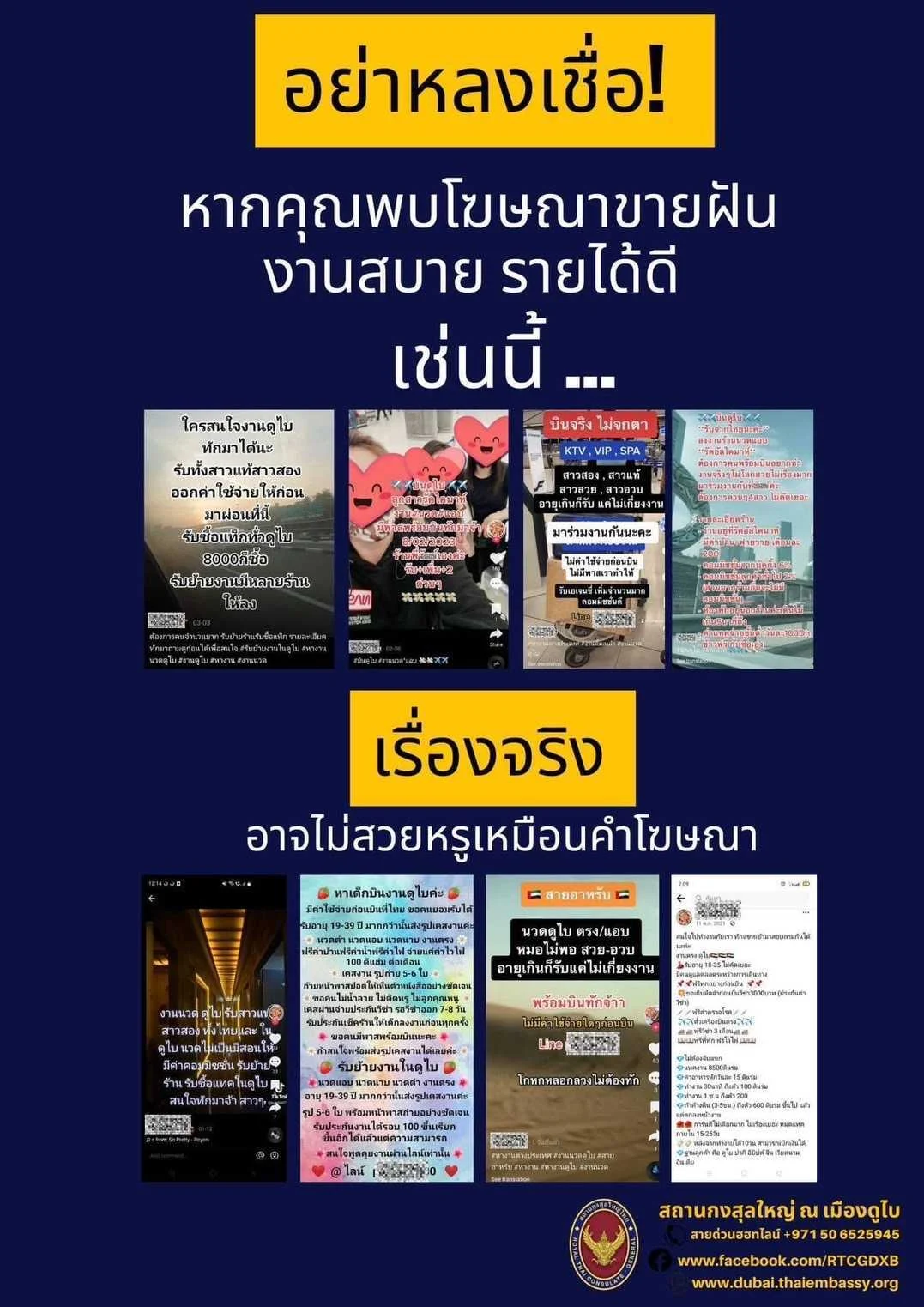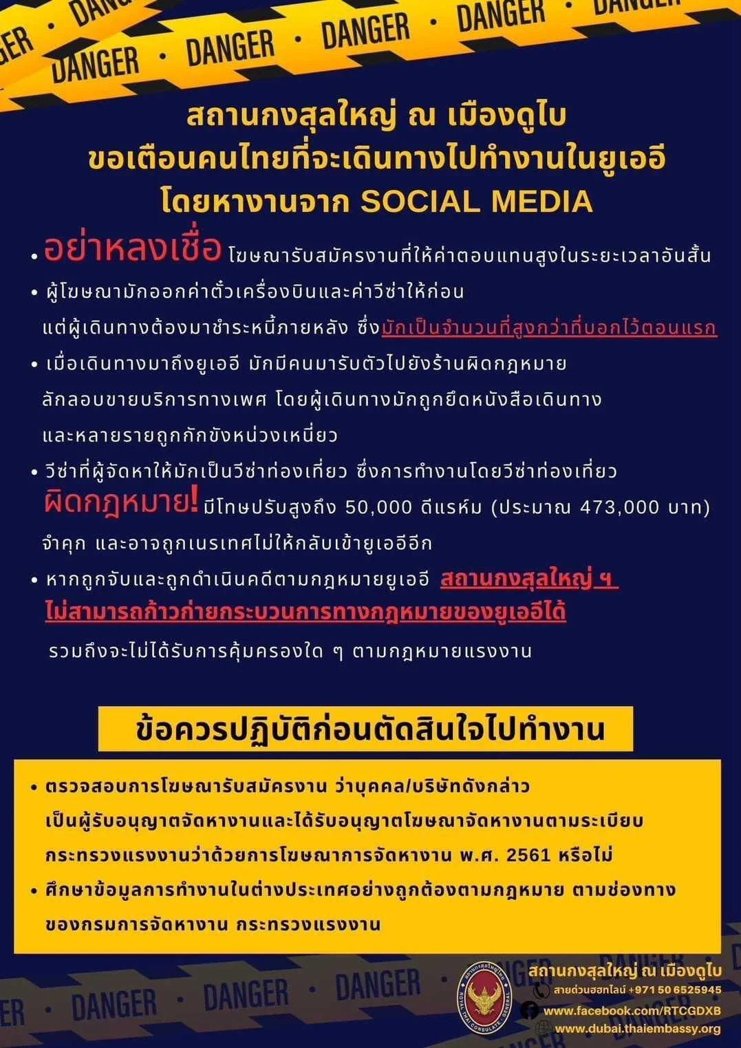 สถานกงสุลใหญ่ ณ เมืองดูไบ แจ้งเตือนคนไทยที่จะไปทำงานที่สหรัฐอาหรับเอมิเรตส์ (UAE) ผ่านโฆษณาจากช่องทางออนไลน์