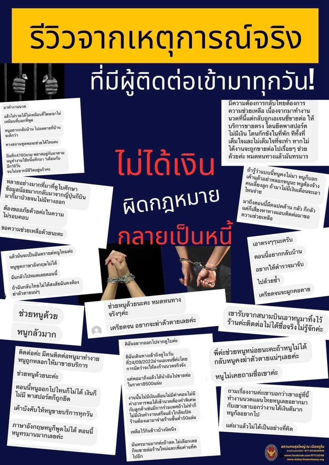 ขณะนี้ พบว่ามีการชักชวนคนไทยไปทำงานที่สหรัฐอาหรับเอมิเรตส์ โดยมีการโฆษณาว่า ให้ค่าตอบแทนสูงในระยะเวลาอันสั้น ซึ่งเมื่อเดินทางไปตามคำโฆษณากลับพบว่าต้องตกเป็นหนี้ในจำนวนที่สูงกว่าที่ตกลงกันตอนแรก บางรายถูกหลอก เพื่อส่งไปทำงานผิดกฎหมาย ลักลอบขายบริการทางเพศ บางรายพบถูกนายจ้างยึดหนังสือเดินทางและถูกกักขังหน่วงเหนี่ยว