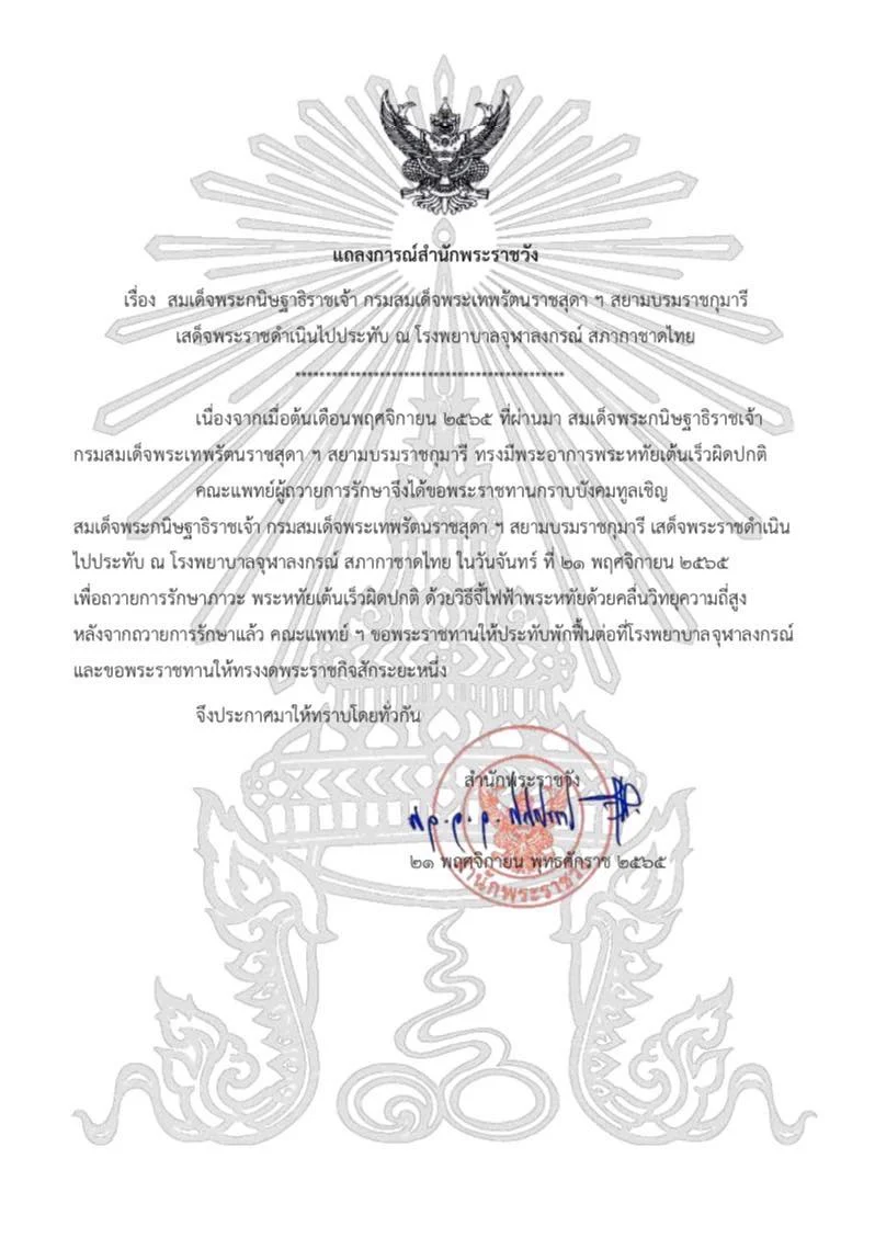 เนื่องจากเมื่อต้นเดือนพฤศจิกายน 2565 ที่ผ่านมา สมเด็จพระกนิษฐาธิราชเจ้า กรมสมเด็จพระเทพรัตนราชสุดาฯ สยามบรมราชกุมารี ทรงมีพระอาการพระหทัยเต้นเร็วผิดปกติ