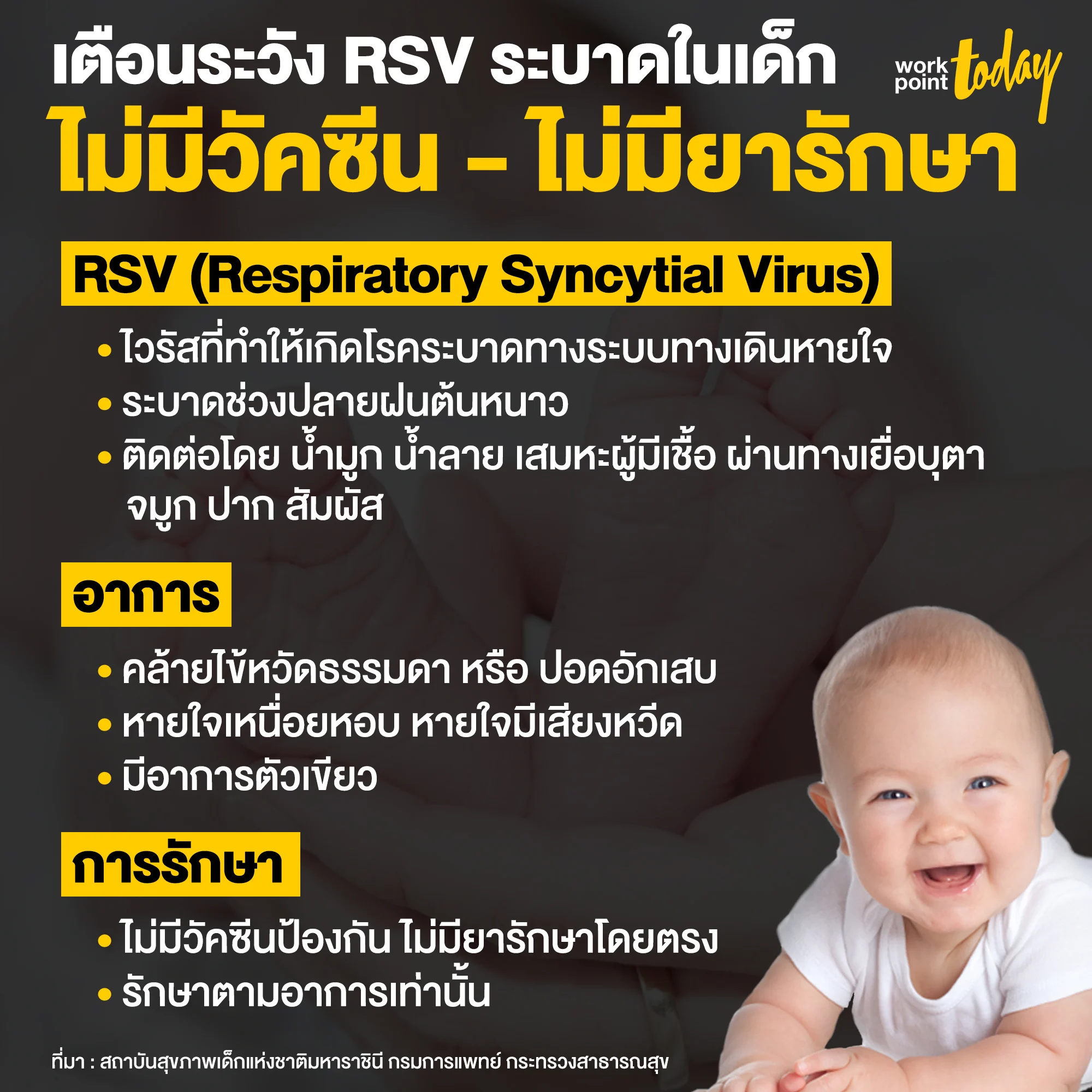 นพ.สมศักดิ์ อรรฆศิลป์ อธิบดีกรมการแพทย์ เปิดเผยว่า เชื้อไวรัส RSV (Respiratory Syncytial Virus) ปกติมักระบาดมากในช่วงปลายฤดูฝนต้นฤดูหนาวหรือประมาณเดือน กรกฎาคม – ตุลาคม เด็กที่ป่วยจะมีอาการเบื้องต้นคล้ายเป็นไข้หวัดธรรมดา มีน้ำมูก ไข้ ไอ จาม พ่อแม่จึงต้องคอยสังเกตอาการของลูกอย่างใกล้ชิด หากมีอาการคล้ายปอดอักเสบร่วมด้วยควรรีบพาเด็กไปพบแพทย์เพื่อรับการรักษาต่อไป