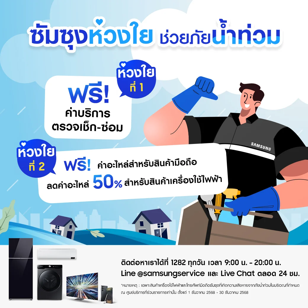 - มอบบริการพิเศษภายใต้โครงการ “Samsung Care for South” ตั้งแต่วันที่ 1 – 30 ธันวาคม 2568 ครอบคลุมพื้นที่ 10 จังหวัดภาคใต้ ได้แก่ ชุมพร สุราษฎร์ธานี นครศรีธรรมราช สตูล พัทลุง ตรัง นราธิวาส ปัตตานี ยะลา และสงขลา โดยมีรายละเอียดดังนี้