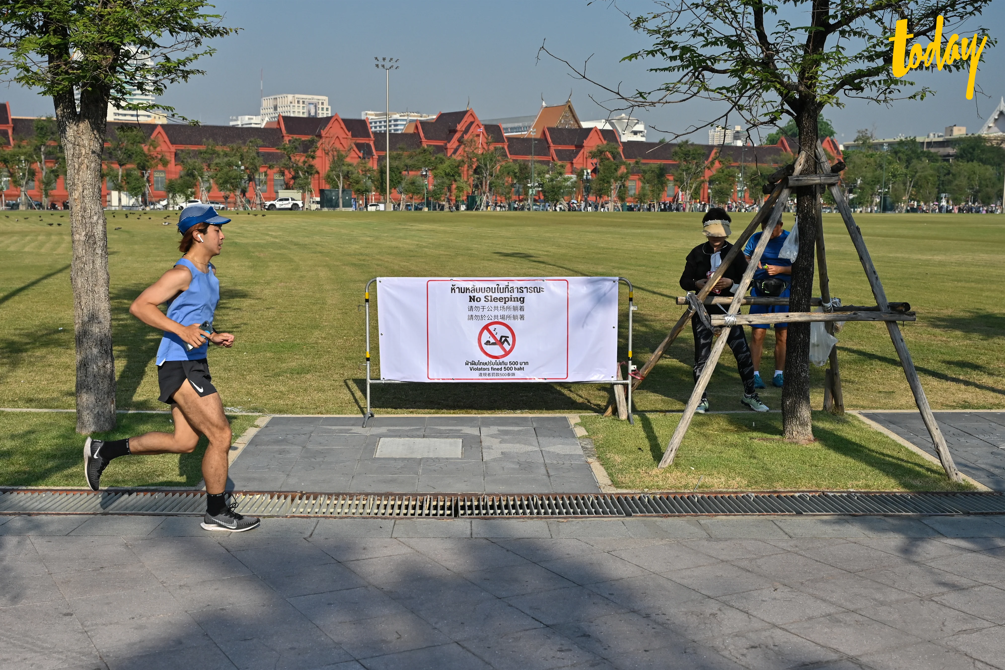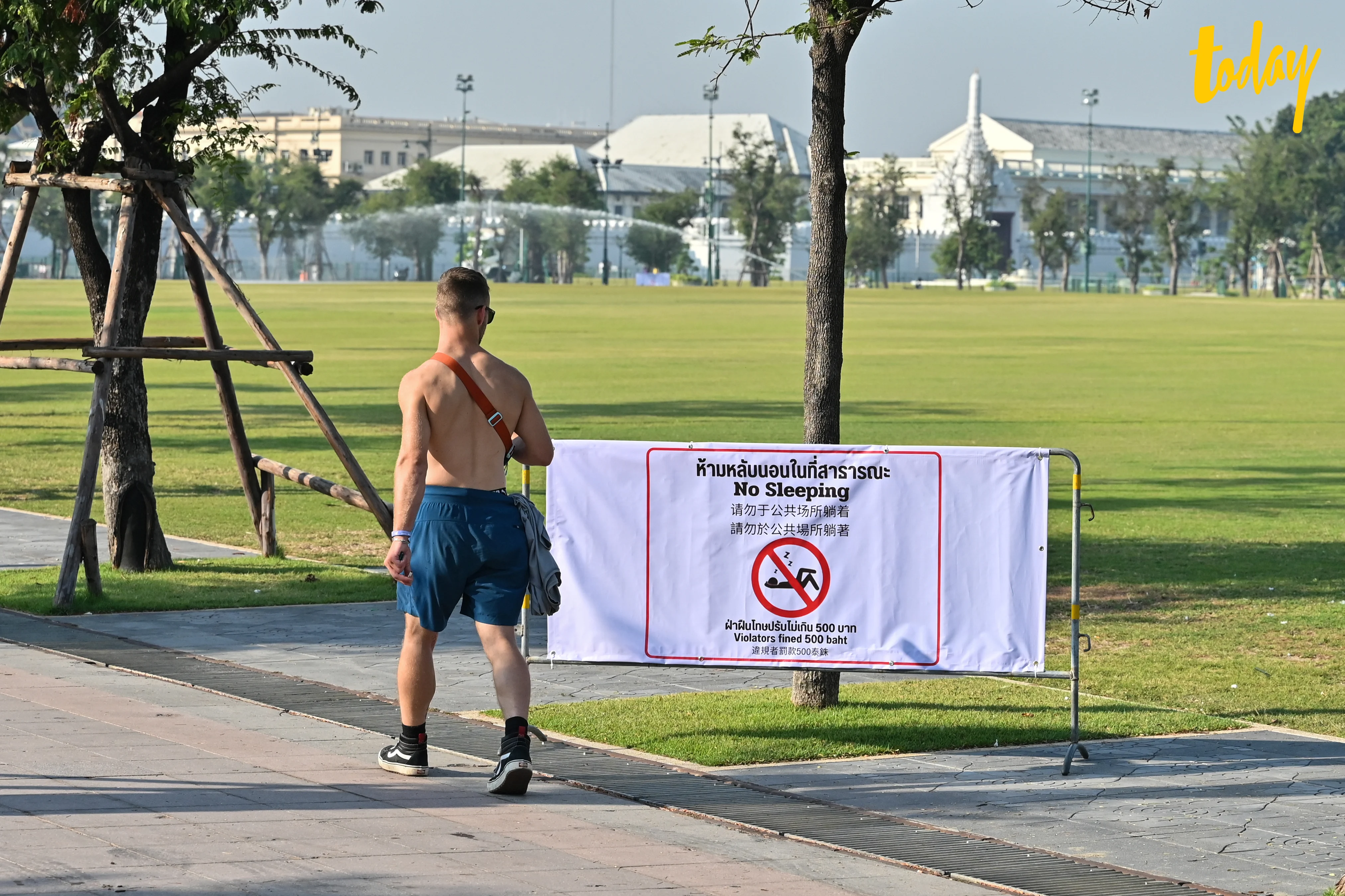 จากการลงพื้นที่สำรวจ ในพื้นที่ท้องสนามหลวง มีการติดตั้งป้าย 3 ภาษา คือ ภาษาไทย ภาษาอังกฤษ และภาษาจีน ระบุข้อความเป็นภาษาไทยว่า “ห้ามหลับนอนในที่สาธารณะ ฝ่าฝืนโทษปรับไม่เกิน 500 บาท” โดยในวันนี้ (18 ม.ค. 67) พบนักท่องเที่ยวต่างชาติ เข้ามานั่งสมาธิ รวมถึงถ่ายรูปเป็นที่ระลึก