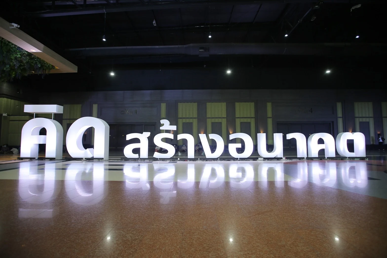 (ป้ายในบริเวณการจัดประชุมใหญ่พรรคสร้างอนาคตไทย ซึ่งวันนี้ยังไม่มีการเปิดตัว ‘นายสมคิด จาตุศรีพิทักษ์’ ที่จะมาเป็นแคนดิเดตนายกรัฐมนตรีของพรรคสร้างอนาคตไทย)